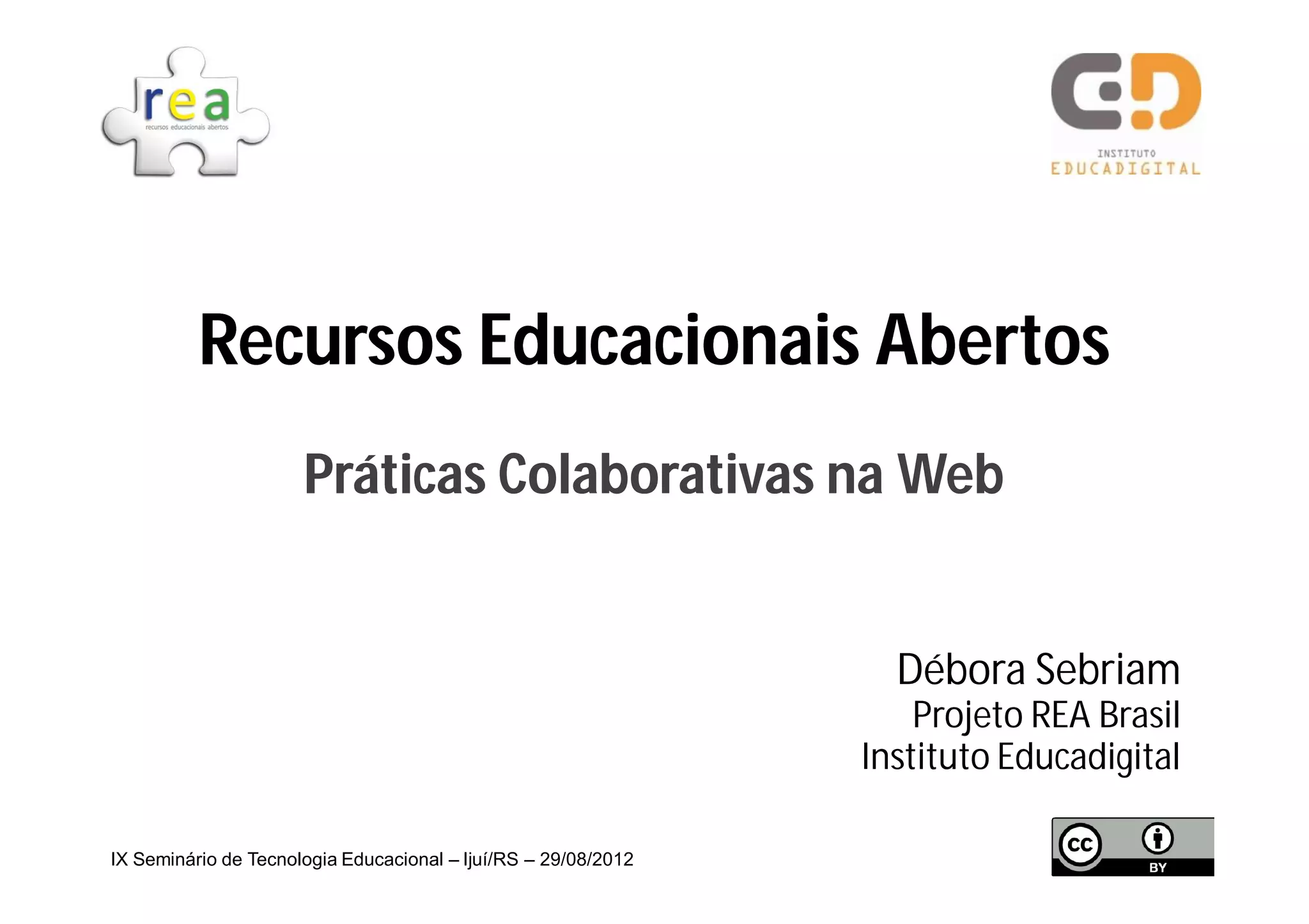 O documento apresenta uma visão abrangente sobre Recursos Educacionais Abertos (REAs), seus princípios e políticas no Brasil, destacando a importância de licenças abertas para maximizar o compartilhamento e o reuso de materiais educacionais. Discute também as inovações trazidas pelas tecnologias digitais e a gestão de propriedade intelectual, além de promover práticas colaborativas em plataformas online. A mensagem central enfatiza a colaboração e o acesso ao conhecimento como fundamentais na era digital.