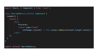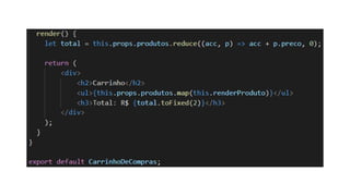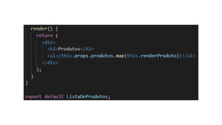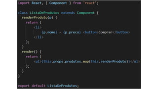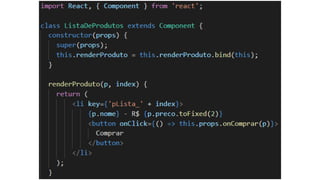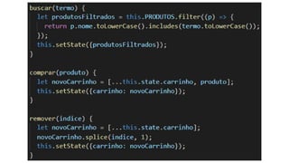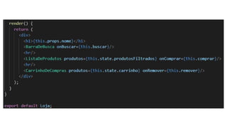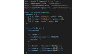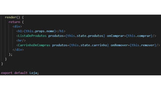 O documento descreve como criar e estruturar um projeto React simples para uma loja online, dividindo-o em componentes como barra de busca, lista de produtos e carrinho de compras. Ele explica como instalar o Create React App, definir o estado inicial dos componentes e fazer atualizações via setState, além de passar e acessar propriedades entre componentes.
