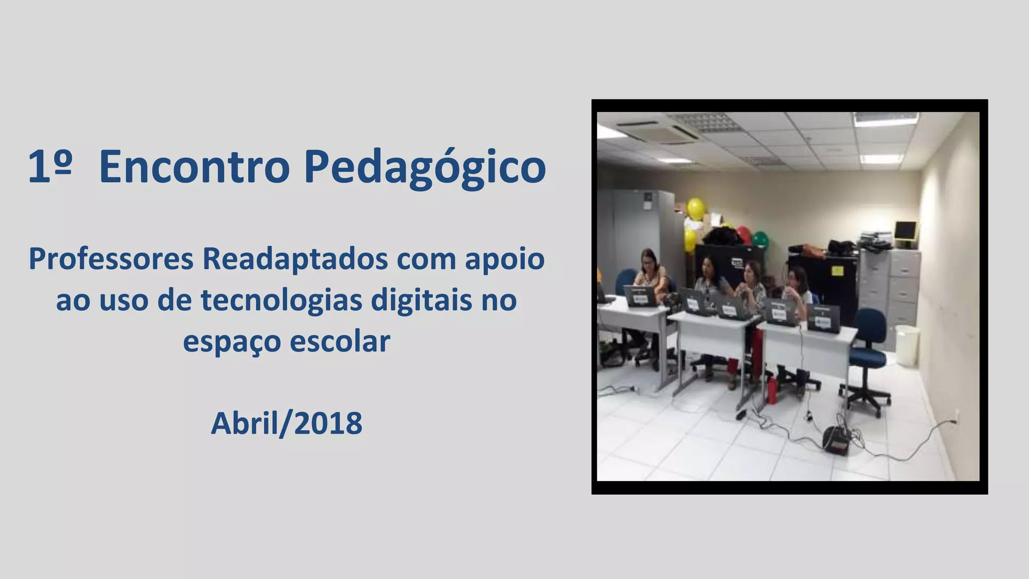 1. O documento discute o primeiro encontro pedagógico para professores readaptados com foco no apoio ao uso de tecnologias digitais no espaço escolar.