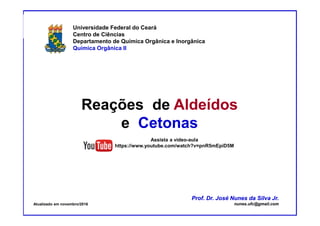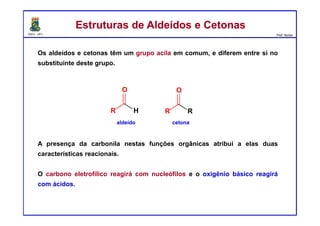 O documento descreve reações de aldeídos e cetonas, incluindo suas estruturas, propriedades e reações de hidratação e formação de acetais. Grupos alquila estabilizam a ligação carbonila enquanto grupos eletroretiradores a desestabilizam, afetando as constantes de equilíbrio. A hidratação é mais favorável para aldeídos simples e menos favorável para cetonas com mais grupos alquila devido aos efeitos eletrônicos e estéricos. A formação de acetais envolve