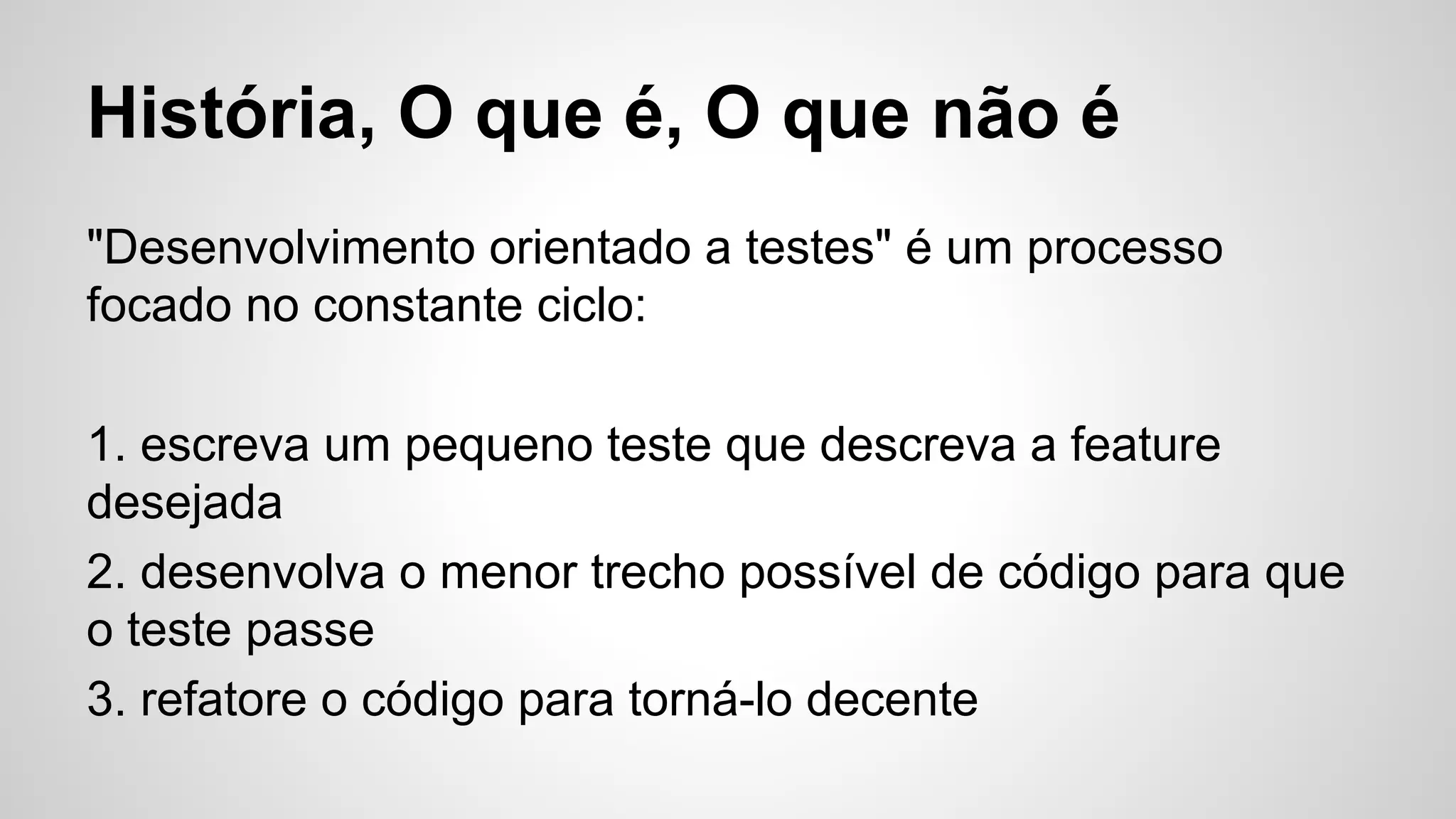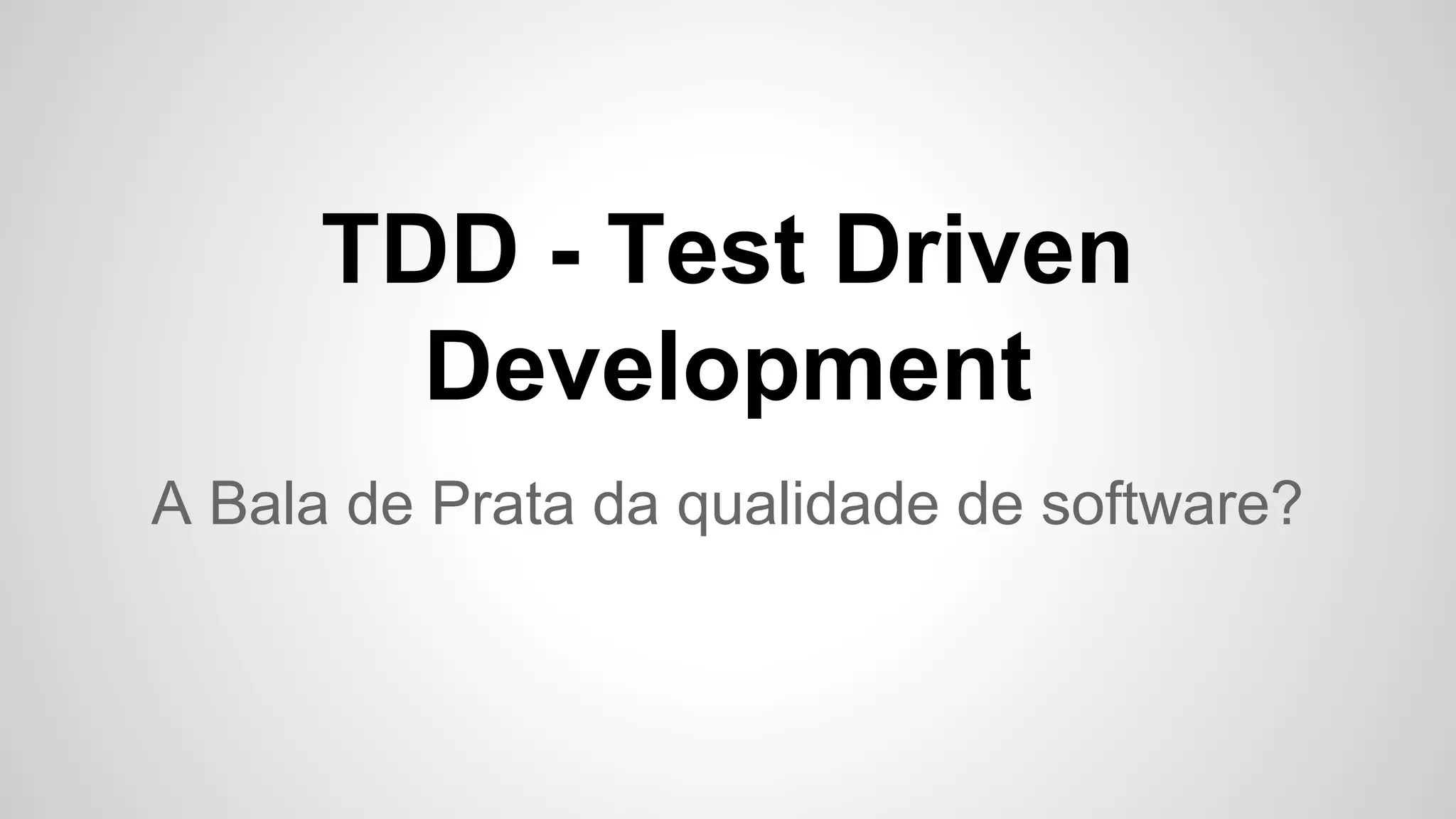TDD - Test Driven Development não é a bala de prata da qualidade de software, mas pode trazer benefícios se bem aplicado. O processo envolve escrever um teste pequeno antes do código funcional correspondente e refatorar continuamente. Isso força o pensamento no requisito antes de codificar e entrega código limpo e funcional, coberto por muitos testes. Porém, requer entendimento do problema, manutenção dos testes e não substitui outras práticas de teste.