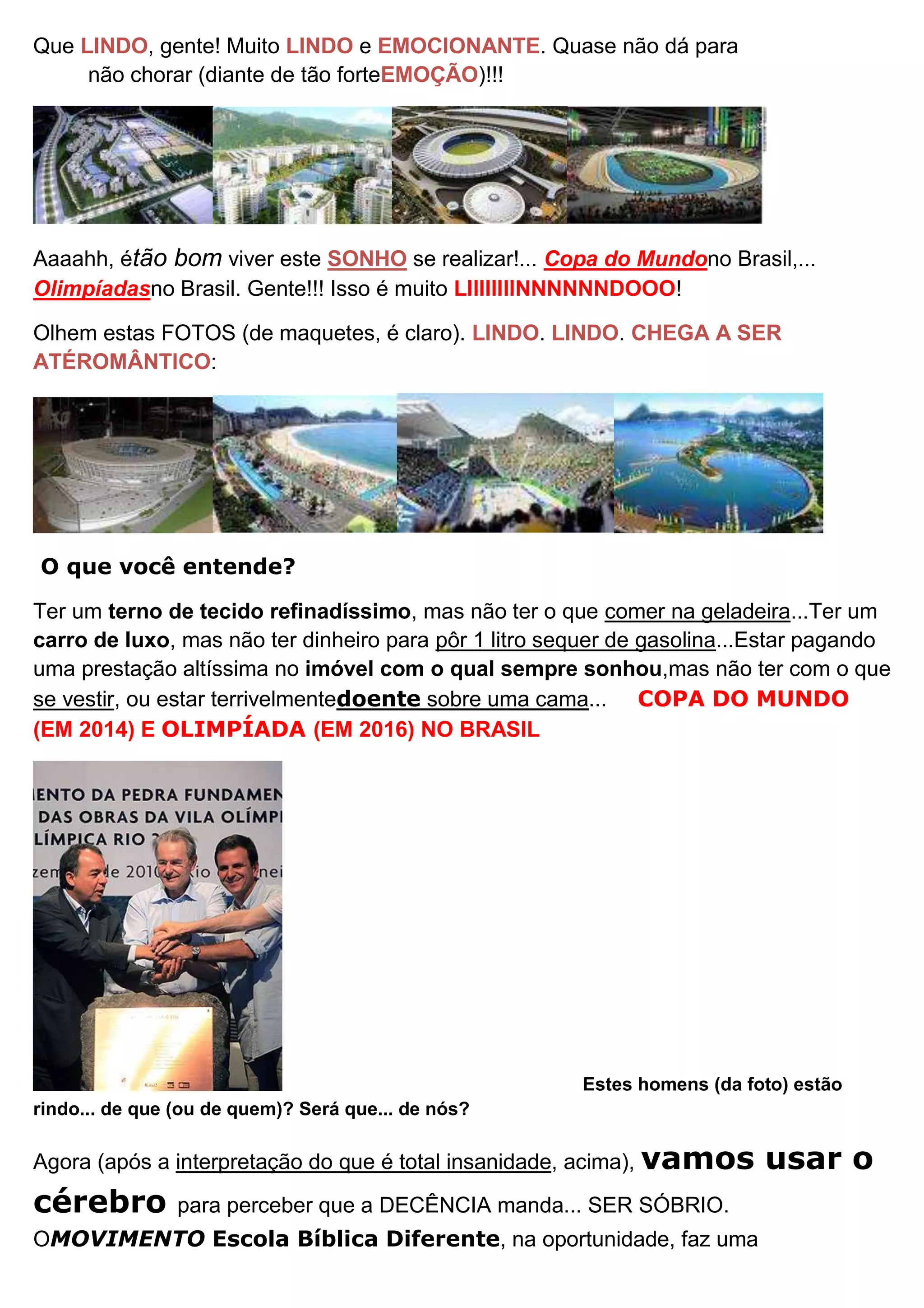 O documento critica os altos gastos com a Copa do Mundo de 2014 e Olimpíadas de 2016 no Brasil em detrimento da saúde, educação e segurança, que enfrentam graves problemas. Questiona se é necessário ignorar a realidade do país para promover esses eventos ou se devem ser priorizadas as reais necessidades do povo brasileiro.