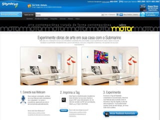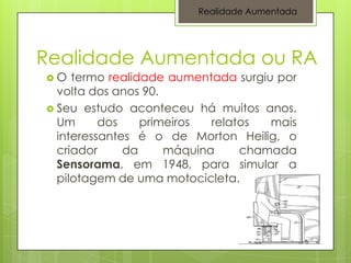 O documento descreve o que é realidade aumentada, suas aplicações em engenharia, educação, entretenimento e marketing. A tecnologia permite combinar elementos virtuais com o ambiente real em tempo real, gerando novas formas de divulgação de produtos e serviços.