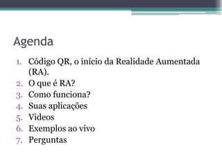 O documento discute a realidade aumentada (RA), definindo-a como a projeção de gráficos virtuais sobre um espaço real. Explica que os códigos QR permitiram armazenar mais informações e iniciaram a RA. Detalha como a RA funciona usando objetos reais, câmeras e software, e fornece exemplos de suas aplicações em games, GPS, publicidade e redes sociais.