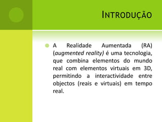 A Realidade Aumentada combina elementos virtuais com o mundo real em tempo real, permitindo a interatividade entre objetos reais e virtuais. Ela funciona capturando imagens do mundo real com câmeras e sobrepondo objetos virtuais gerados por software. A Realidade Aumentada tem aplicações em cirurgias, arquitetura, navegação e conferências e é usada em dispositivos móveis através de aplicativos.