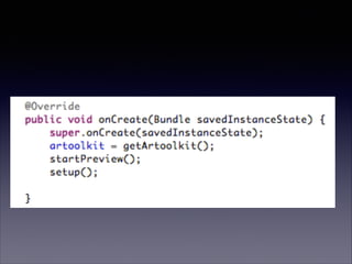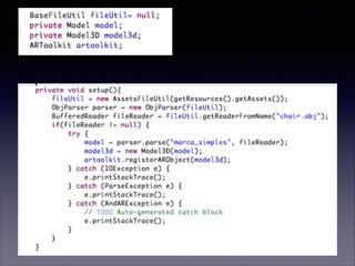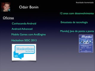 O documento fornece informações sobre realidade aumentada, incluindo: (1) uma introdução ao que é realidade aumentada; (2) detalhes sobre como desenvolver um aplicativo de realidade aumentada no Android usando o framework AndAR; (3) discussões sobre visão computacional e OpenGL que são usados na realidade aumentada.