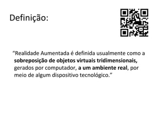 A Realidade Aumentada sobrepõe objetos virtuais ao ambiente real através de dispositivos tecnológicos. Foi proposta na década de 90 para treinamento de pilotos e combina elementos reais e virtuais de forma interativa e em tempo real. Pode ser usada em construção, medicina, entretenimento, cultura e publicidade.
