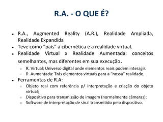 O documento apresenta uma introdução à realidade aumentada, definindo o conceito, ferramentas e aplicações atuais. Explica que a realidade aumentada combina elementos virtuais com o mundo real através de dispositivos como câmeras, e fornece exemplos de uso em medicina, publicidade, arquitetura e entretenimento. Também lista bibliotecas e ambientes de desenvolvimento para criação de aplicativos de realidade aumentada.