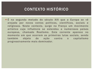 O documento descreve o movimento artístico Realismo que surgiu na França no século XIX como uma reação ao subjetivismo do Romantismo e enfatizava uma abordagem objetiva da realidade social. Detalha as características do Realismo e apresenta os principais autores desse movimento no Brasil e Portugal, como Machado de Assis, Aluísio Azevedo e Eça de Queirós, junto com suas principais obras. Fornece também referências bibliográficas sobre o assunto.