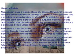 O documento descreve o movimento artístico do Realismo que surgiu na segunda metade do século XIX caracterizado pela representação objetiva da realidade e interesse em temas sociais. O Realismo atingiu seu ápice na literatura com romances que criticavam a sociedade da época de forma direta. Algumas das principais obras literárias realistas citadas são Madame Bovary de Gustave Flaubert e os romances de Dostoiévski, Tolstói e Eça de Queiroz.