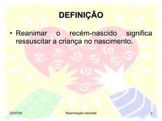 O documento discute os procedimentos de reanimação neonatal, incluindo preparação para a reanimação, avaliação inicial do recém-nascido, cuidados de rotina, passos iniciais de reanimação, ventilação com pressão positiva, intubação traqueal e massagem cardíaca. Fornece detalhes sobre equipamentos, técnicas e indicações para cada procedimento.