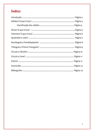 Este documento apresenta um resumo dos principais conceitos de áreas e volumes de sólidos geométricos. Explica que sólidos são conjuntos de pontos tridimensionais e classifica-os em poliedros e não-poliedros. Define o que são áreas e volumes e apresenta as fórmulas para calcular a área e volume das figuras planas e sólidos mais comuns como quadrados, cubos, retângulos, cilindros e esferas.
