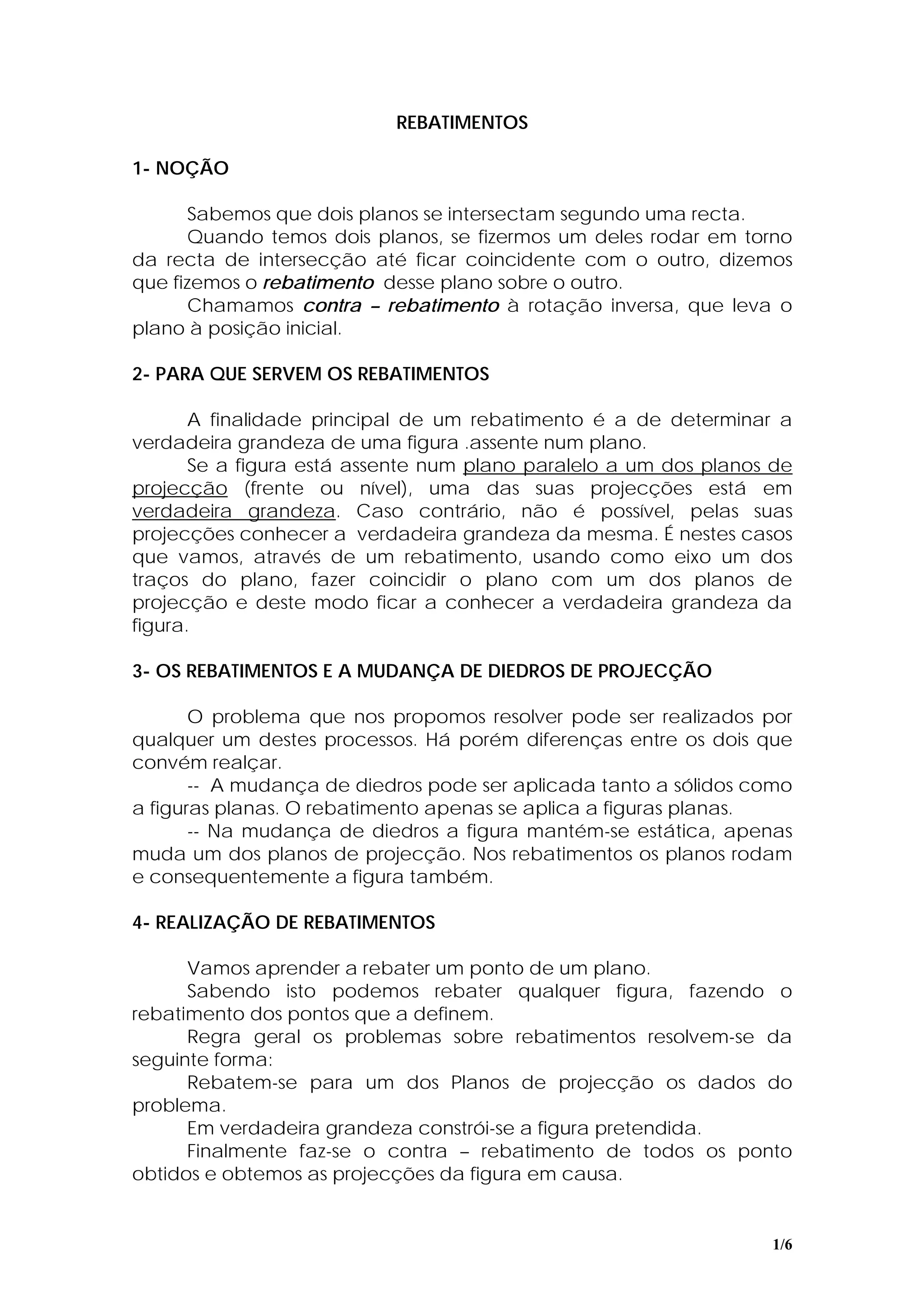O documento descreve os conceitos de rebatimento de planos, que é o processo de rotacionar um plano em torno de sua linha de interseção com outro plano até coincidir. Isso é usado para determinar a verdadeira grandeza de figuras. Os passos para realizar rebatimentos são: 1) rebater os dados para um plano de projeção, 2) construir a figura em verdadeira grandeza, 3) fazer o contra-rebatimento para obter as projeções.