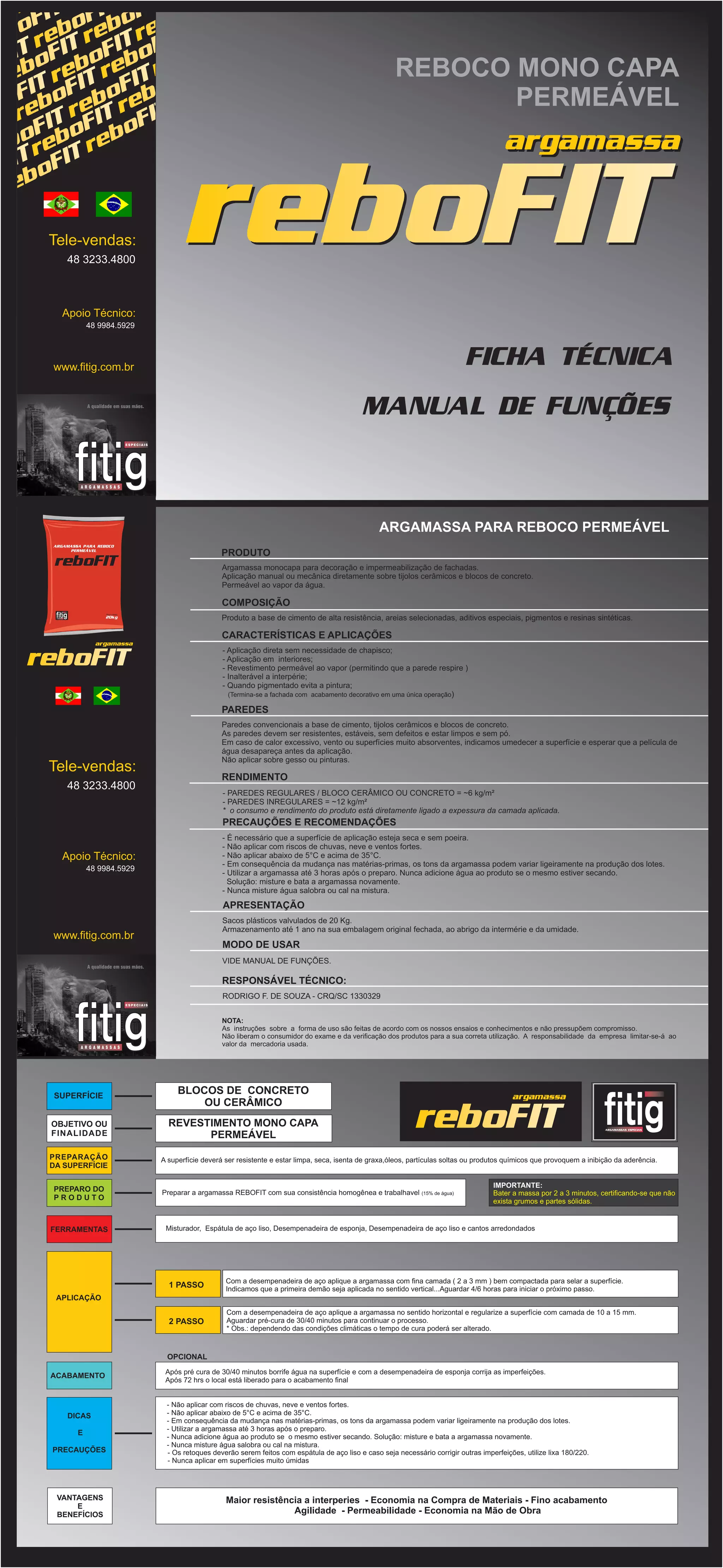 Este documento fornece instruções sobre o uso de uma argamassa para revestimento de paredes chamada reboFIT. Ele descreve como preparar a superfície, misturar o produto, aplicá-lo em camadas e cuidados necessários. Também lista vantagens como maior resistência, economia e acabamento fino.