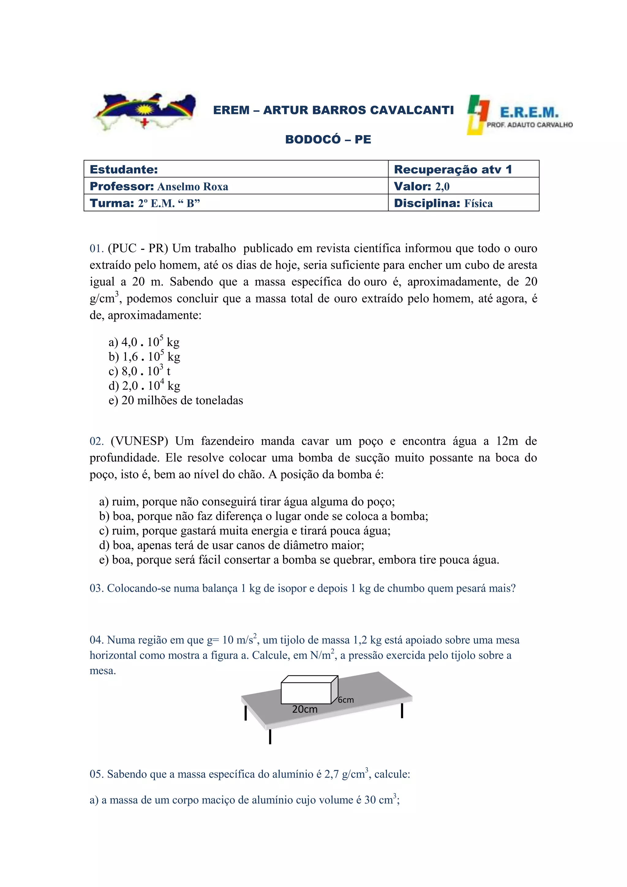 1) O documento fornece uma prova de recuperação de um estudante com 8 questões de física.