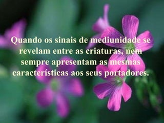 Este documento discute as características da mediunidade e fornece orientações para médiuns. Ele explica que cada médium experiencia a mediunidade de maneira única e que é importante que médiuns se preparem através de estudos para desenvolver discernimento. O documento também ressalta a importância de médiuns lerem obras de estudiosos espíritas para aumentar seus conhecimentos.