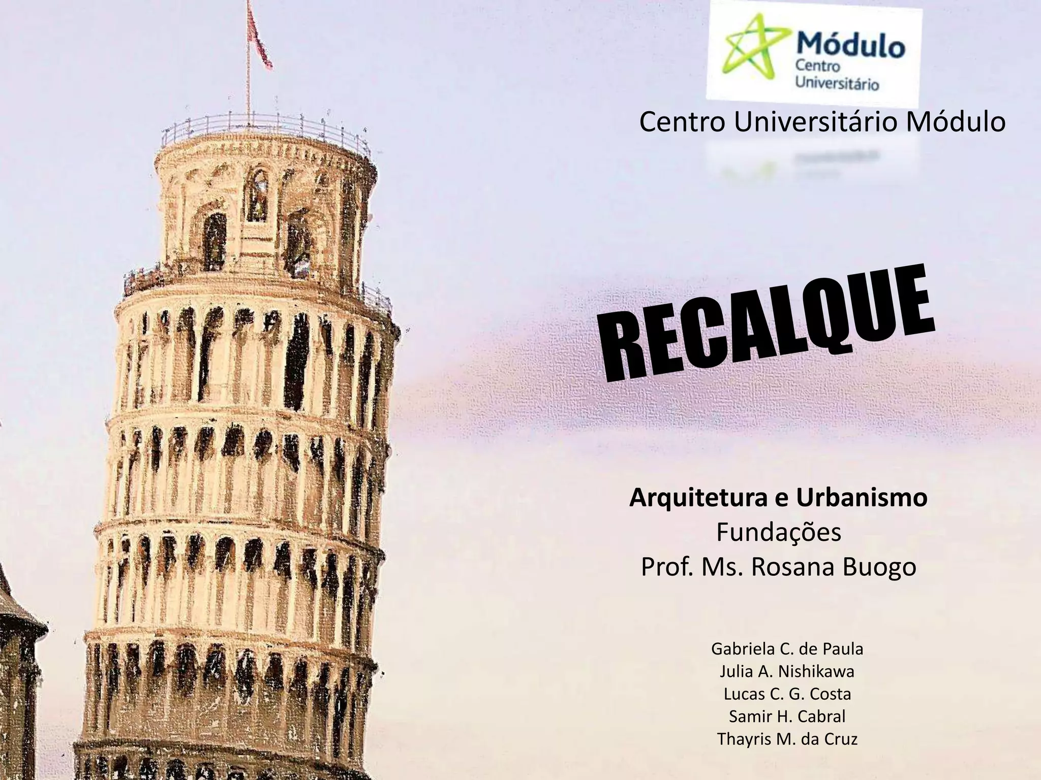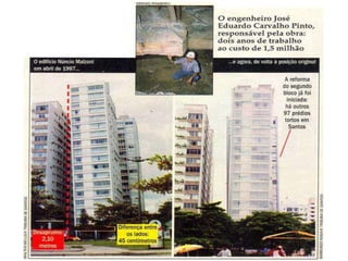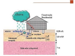 O documento discute recalques em solos, especificamente em solos argilosos moles e solos colapsíveis. Apresenta as causas e tipos de recalque e seus efeitos em estruturas. Também fornece exemplos como a Torre de Pisa e prédios em Santos que sofreram danos devido a recalques diferenciais.