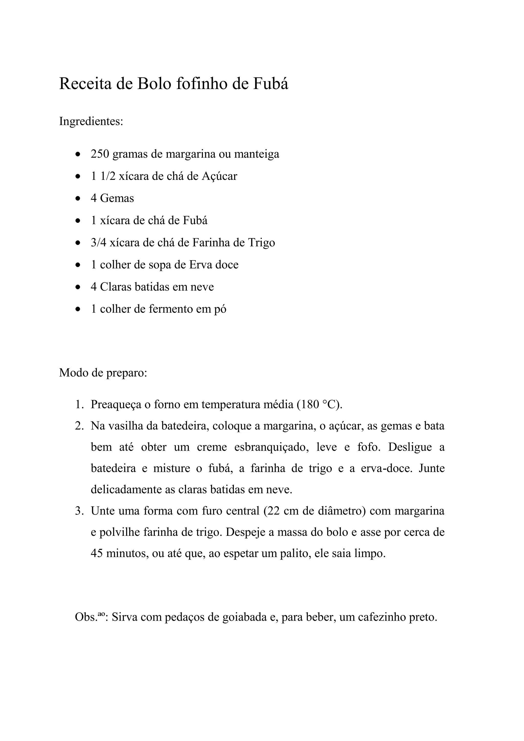 A receita resume-se em 3 passos: 1) bater margarina, açúcar e gemas até creme esbranquiçado; 2) misturar fubá, farinha e erva-doce ao creme e incorporar claras em neve; 3) assar a massa por 45 minutos em forma untada até o palito sair limpo.