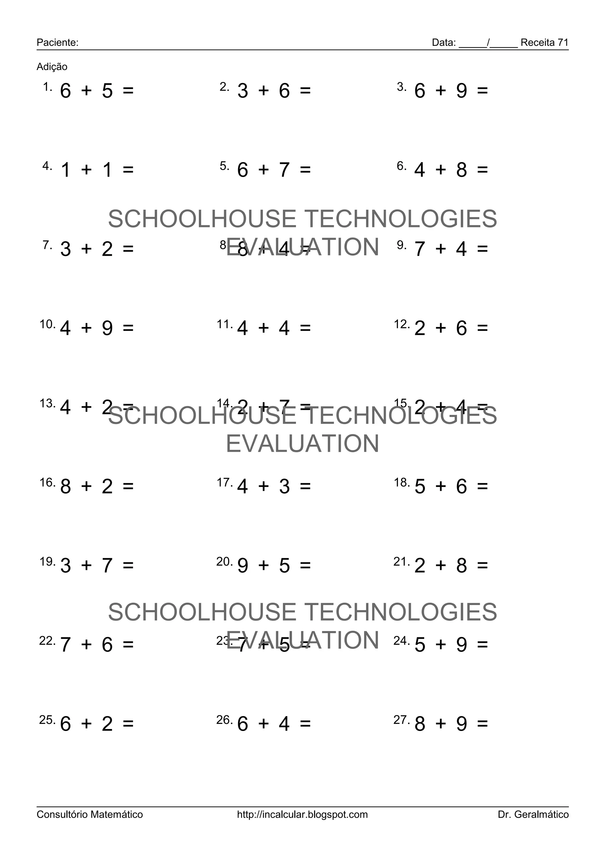 O documento contém 27 adições simples com números de 1 a 17. As adições estão organizadas em uma tabela com 3 operações por linha para demonstrar conceitos básicos de adição para avaliação escolar.