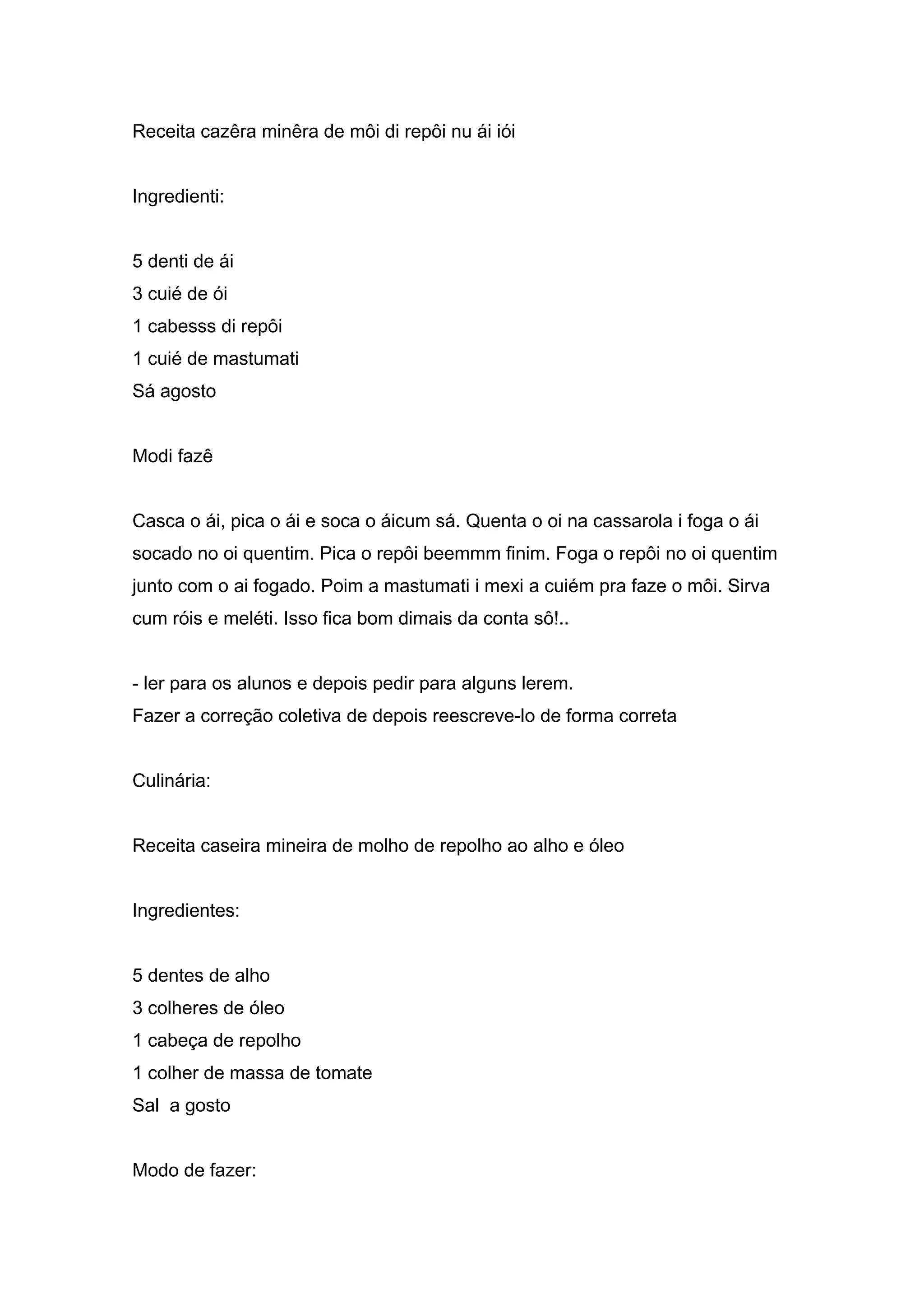 A receita descreve um molho caseiro mineiro de repolho ao alho e óleo, com instruções para descascar e picar alho, refogá-lo em óleo quente e depois adicionar repolho picado fino e massa de tomate para fazer o molho, a ser servido com arroz e omelete.