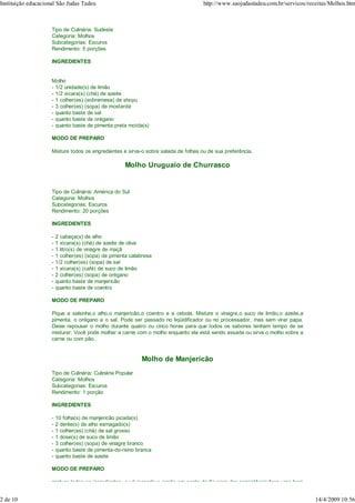 1) O documento apresenta receitas de diferentes molhos, incluindo molho de carne light, molho madeira, molho especial para salada e molho uruguaio de churrasco.