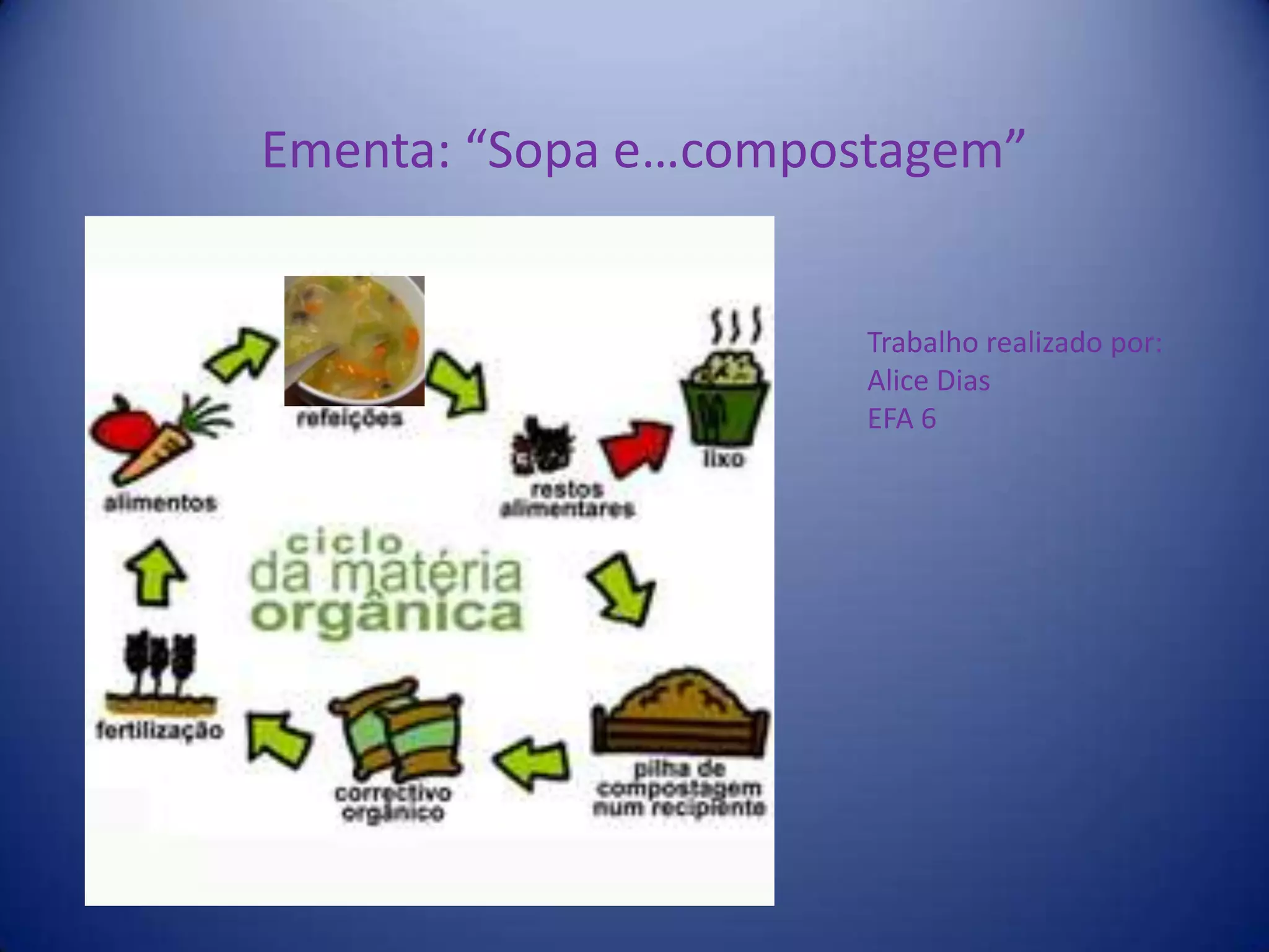 O documento descreve uma receita de sopa e prato principal, bem como instruções para compostagem de restos de comida e jardim. Detalha como preparar um compostor com camadas de materiais que fornecem arejamento, humidade e nutrientes para decompor os resíduos orgânicos em adubo para o jardim. Explica que os resíduos verdes e castanhos fornecem carbono e nitrogénio necessários para os microrganismos decomporem a matéria orgânica.