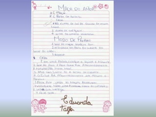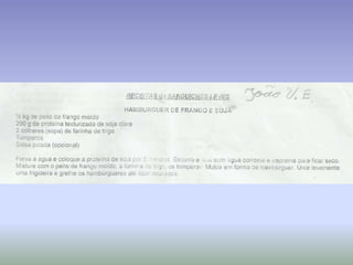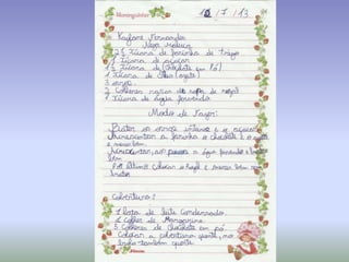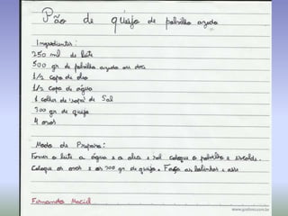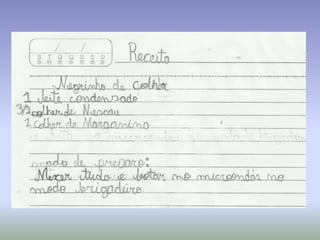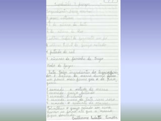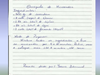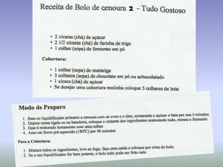 Este documento fornece instruções para fazer um bolo torta felpudo em três camadas. A massa do bolo é feita com gemas, açúcar, farinha e leite. As três camadas de recheio são: uma calda de coco, um creme amarelo feito com leite condensado e um merengue feito com claras e açúcar. O bolo serve 20 porções e é fornecido com uma receita da mãe de Brenda Balbom.