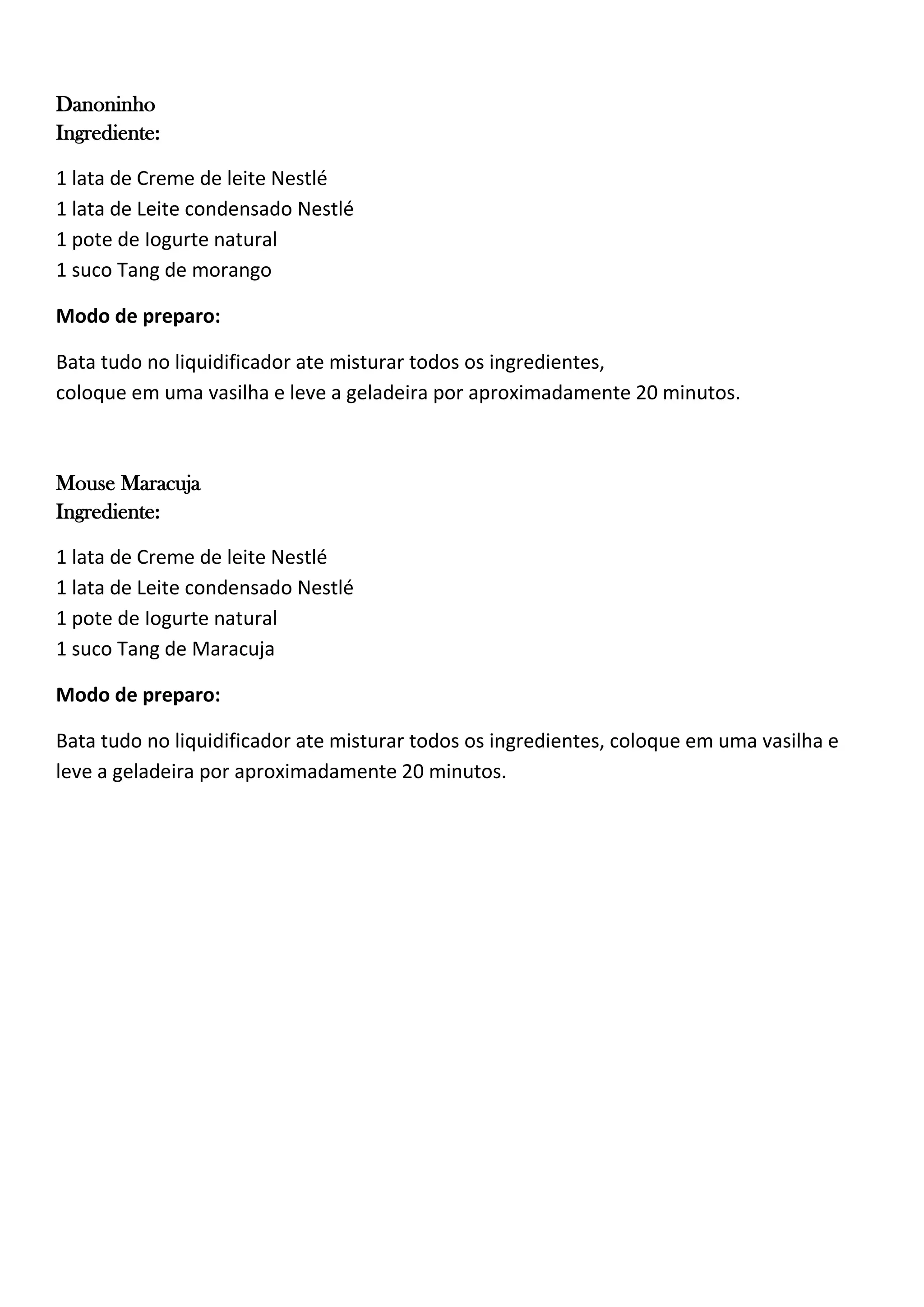 Os documentos fornecem receitas para vários tipos de sobremesas e bolos, incluindo Danoninho, Mouse de Maracujá, Sobremesa de Morangos, Pavê de Bis, Bolo Chocolate e outros. Todas as receitas incluem ingredientes e instruções de preparo detalhadas.