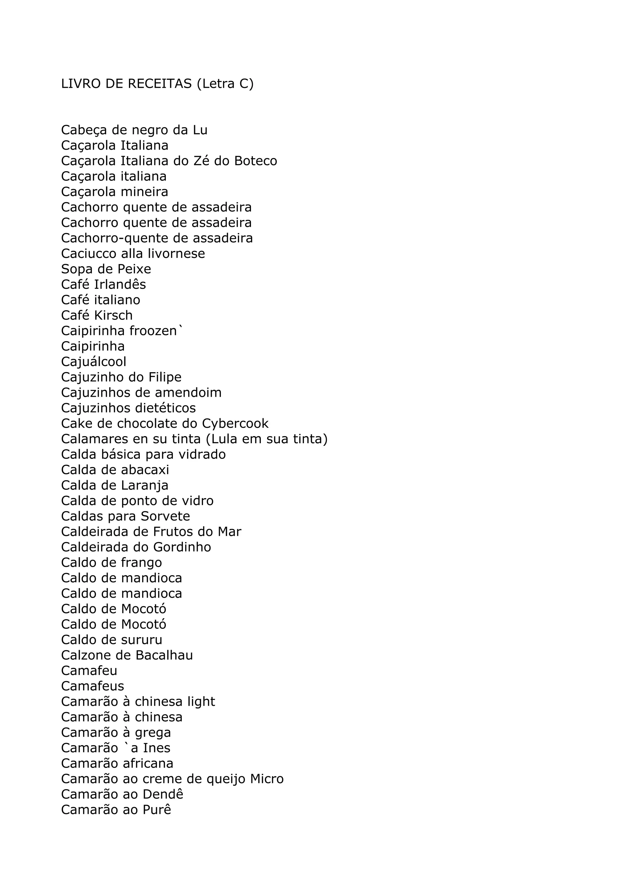 1) O documento apresenta receitas culinárias que começam com a letra C, incluindo Cabeça de negro da Lu, Caçarola Italiana e Caçarola Italiana do Zé do Boteco.
