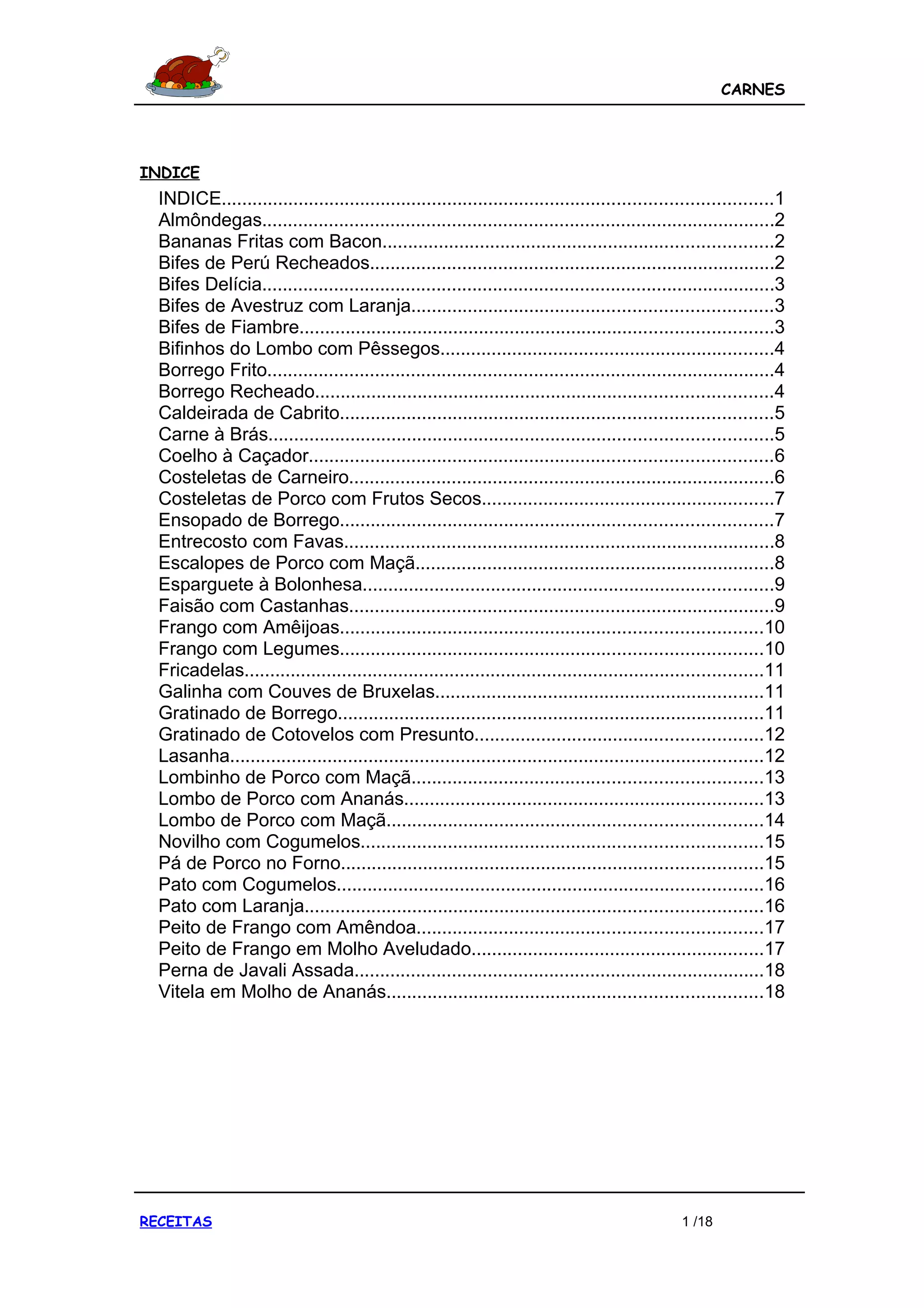 Este documento fornece receitas de carnes, incluindo almôndegas, bifes de perú recheados, borrego frito, caldeirada de cabrito, e coelho à caçador. As receitas variam de 1 a 3 ingredientes e 1 a 5 passos de preparação.