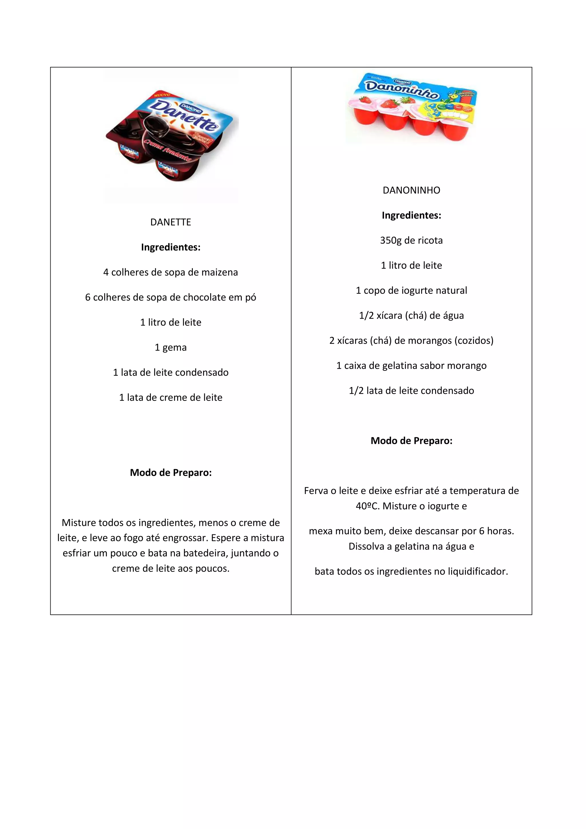 O documento apresenta receitas para Danoninho, Doritos e Barra de Cereais. O Danoninho é feito com ricota, leite e morangos cozidos. Os Doritos são salgadinhos de massa frita com tempero vermelho. A Barra de Cereais leva aveia, nozes, castanhas e outros ingredientes misturados e assados.