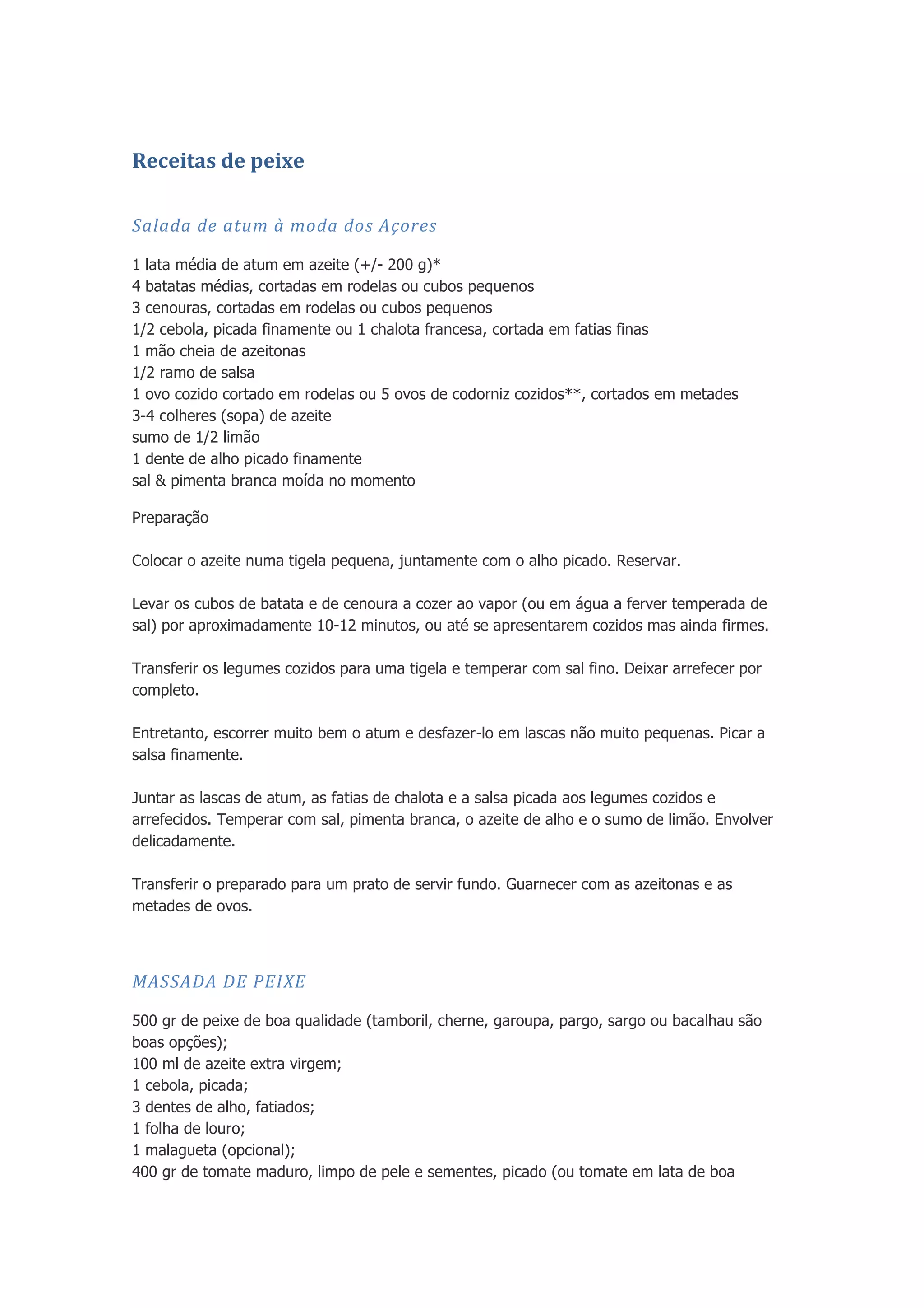 O documento apresenta várias receitas de pratos à base de peixe, incluindo: (1) uma salada de atum típica dos Açores com legumes, ovos e ervas; (2) uma massada de peixe com tomate, vinho branco e massa; e (3) um gratinado de bacalhau com brócolos, batatas e molho bechamel.
