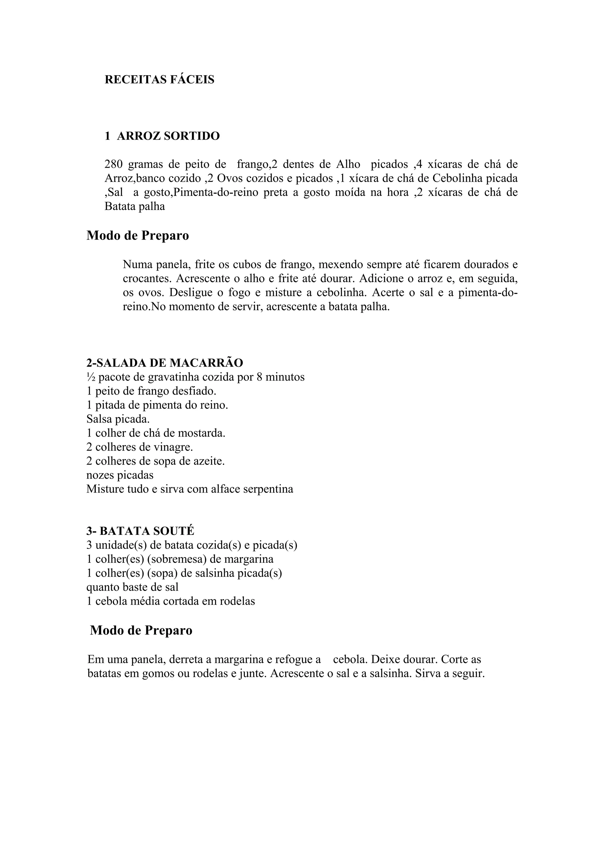 O documento fornece receitas fáceis de pratos como arroz sortido, salada de macarrão, batata souté, frango crocante com creme de milho, frango xadrez e almôndegas de frango. As receitas requerem ingredientes comuns e fornecem instruções passo a passo para prepará-las.