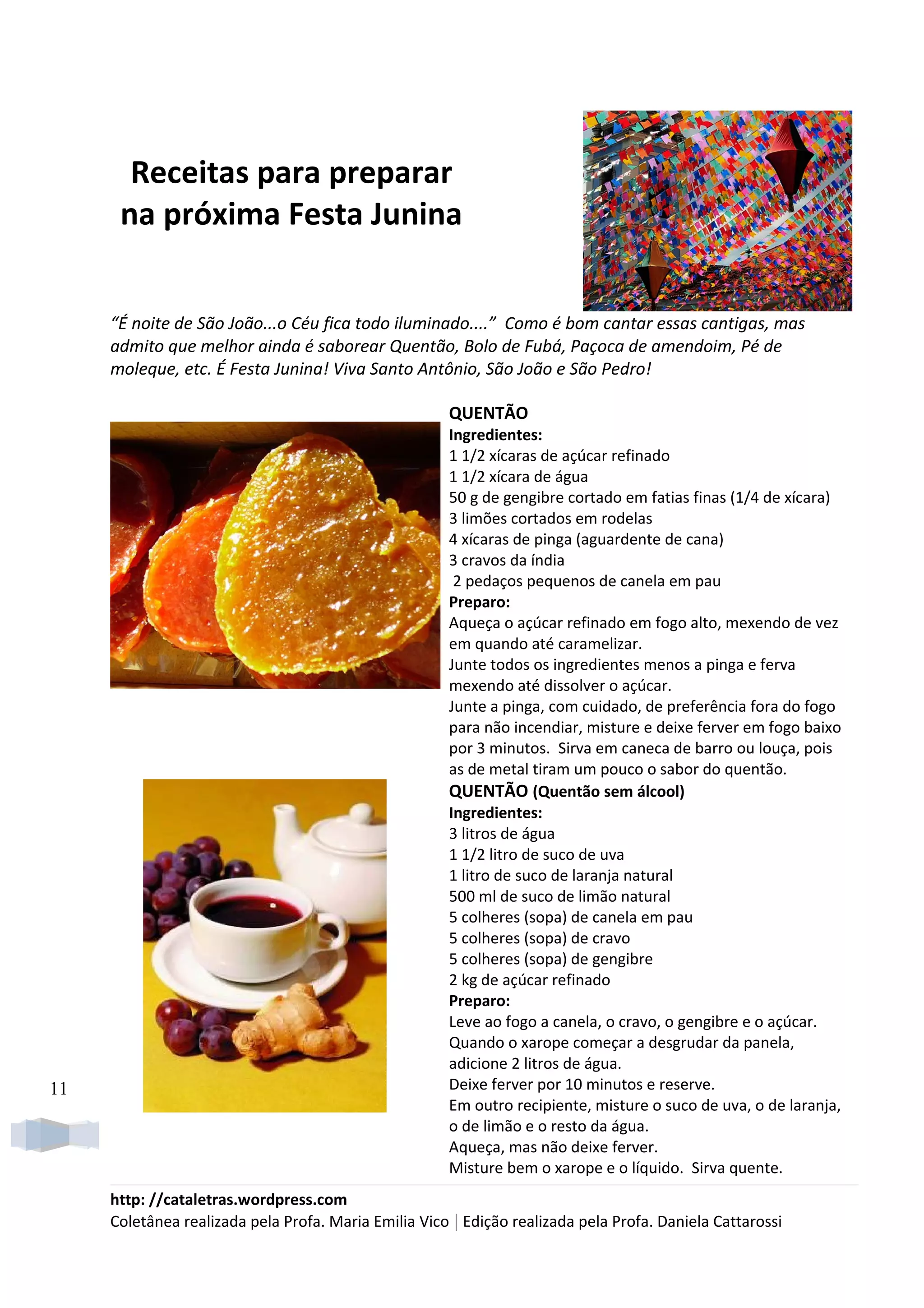 1) O documento fornece receitas típicas da Festa Junina, incluindo Quentão, Vinho Quente, Paçoca de Amendoim e outros doces.