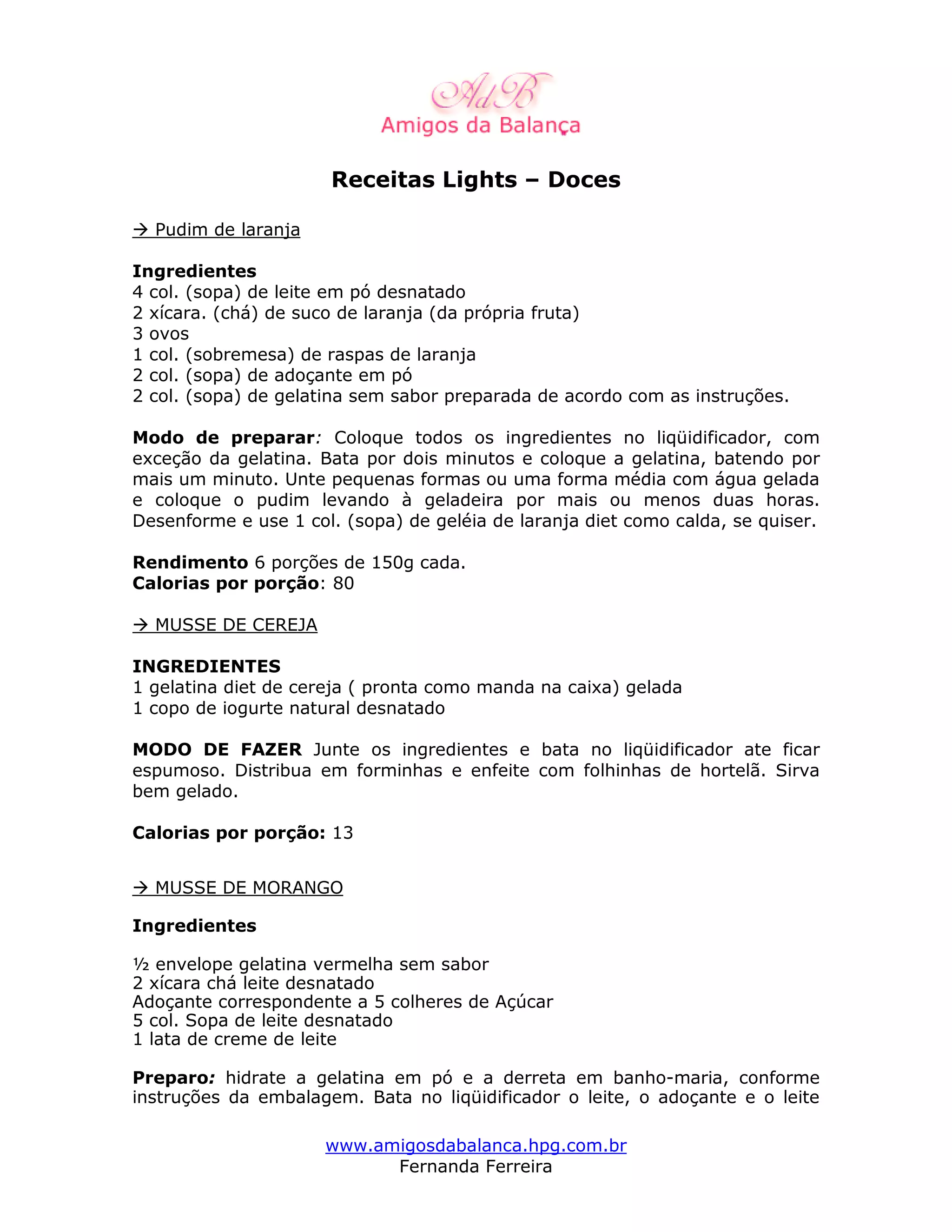As três frases resumem os principais doces e sobremesas light apresentados no documento, com ênfase nas calorias por porção de cada um. São eles: o pudim de laranja com 80 calorias por porção, a mousse de cereja com 13 calorias por porção e o arroz doce com 110 calorias por porção. O documento fornece várias receitas de sobremesas e doces light, incluindo suas instruções de preparo e quantidades de ingredientes.
