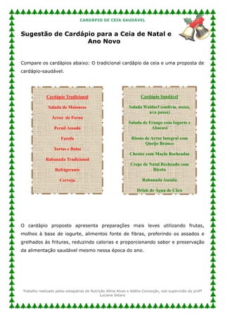 O documento fornece dicas e sugestões para compor uma ceia de Natal e Ano Novo saudável, substituindo alimentos tradicionais por opções mais leves e nutritivas. Apresenta um cardápio completo com entradas, prato principal, acompanhamentos e sobremesa que priorizam ingredientes como frutas, legumes e molhos à base de iogurte em substituição a frituras e excesso de gordura.