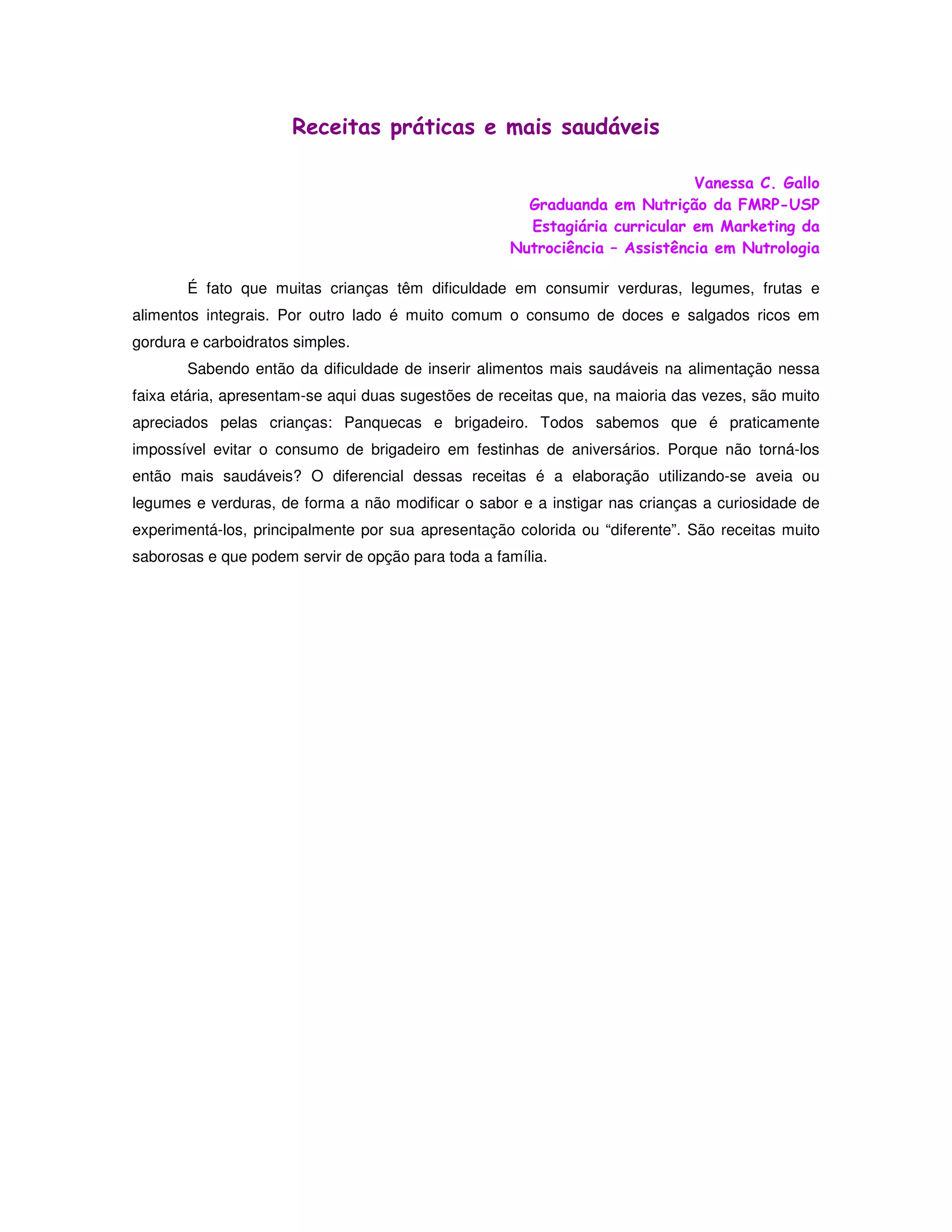 Este documento fornece duas receitas saudáveis - brigadeiro com aveia e panquecas coloridas - que podem ser apreciadas por crianças. O brigadeiro com aveia substitui parte do leite condensado por aveia, fibra solúvel que traz benefícios à saúde. As panquecas coloridas são feitas com beterraba, espinafre e cenoura que fornecem nutrientes como vitaminas A, C e minerais. O documento também explica os benefícios nutricionais dessas hortaliças.