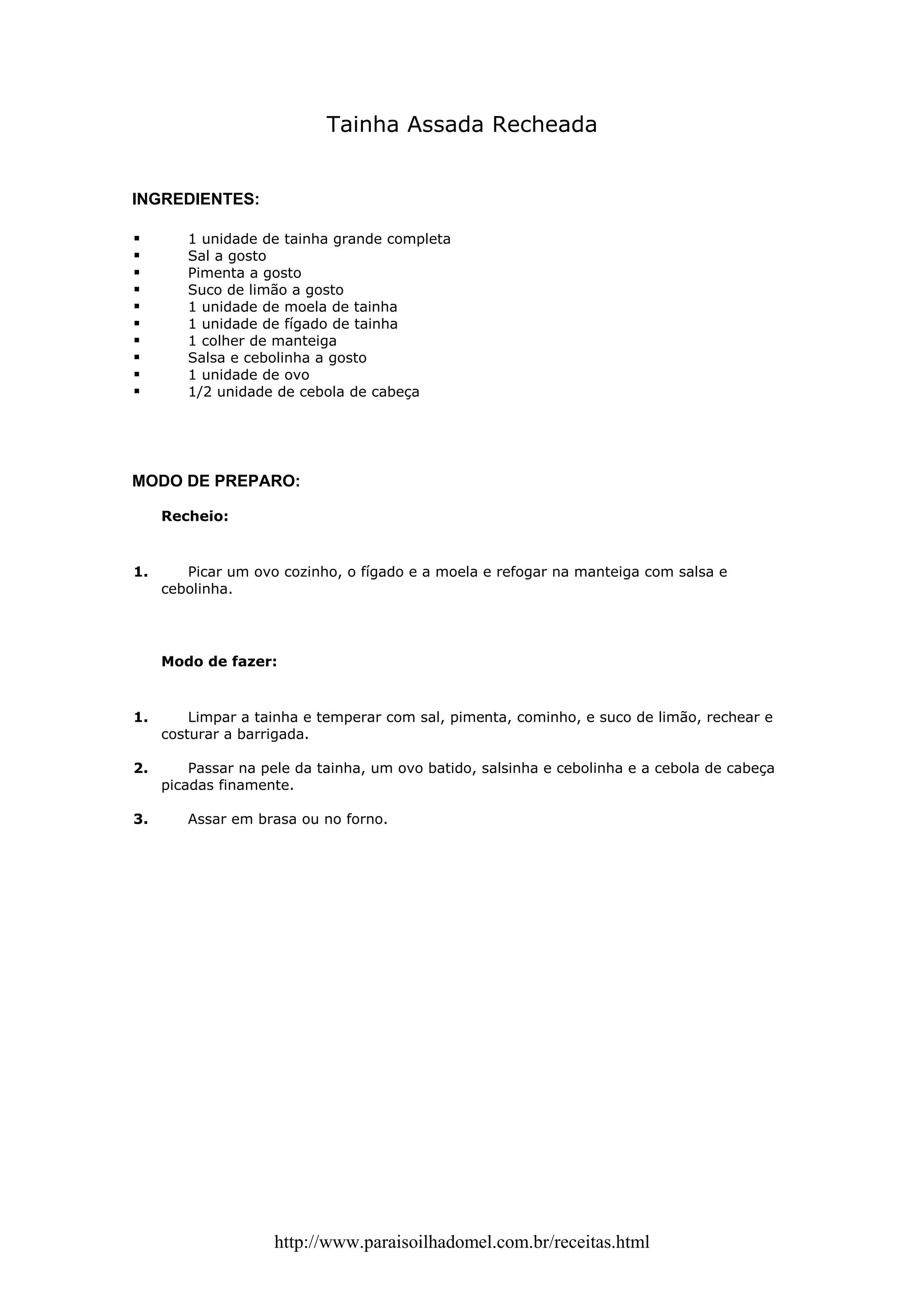 A receita resume-se em 3 frases: A receita ensina como preparar uma tainha assada recheada, com o recheio feito de ovo cozido, fígado e moela de tainha refogados em manteiga com salsa e cebolinha. A tainha é temperada internamente e costurada para receber o recheio, e é assada na brasa ou no forno depois de ser temperada externamente com ovo batido, salsinha e cebolinha picadas. A receita foi retirada do site Paraíso Ilha do Mel.
