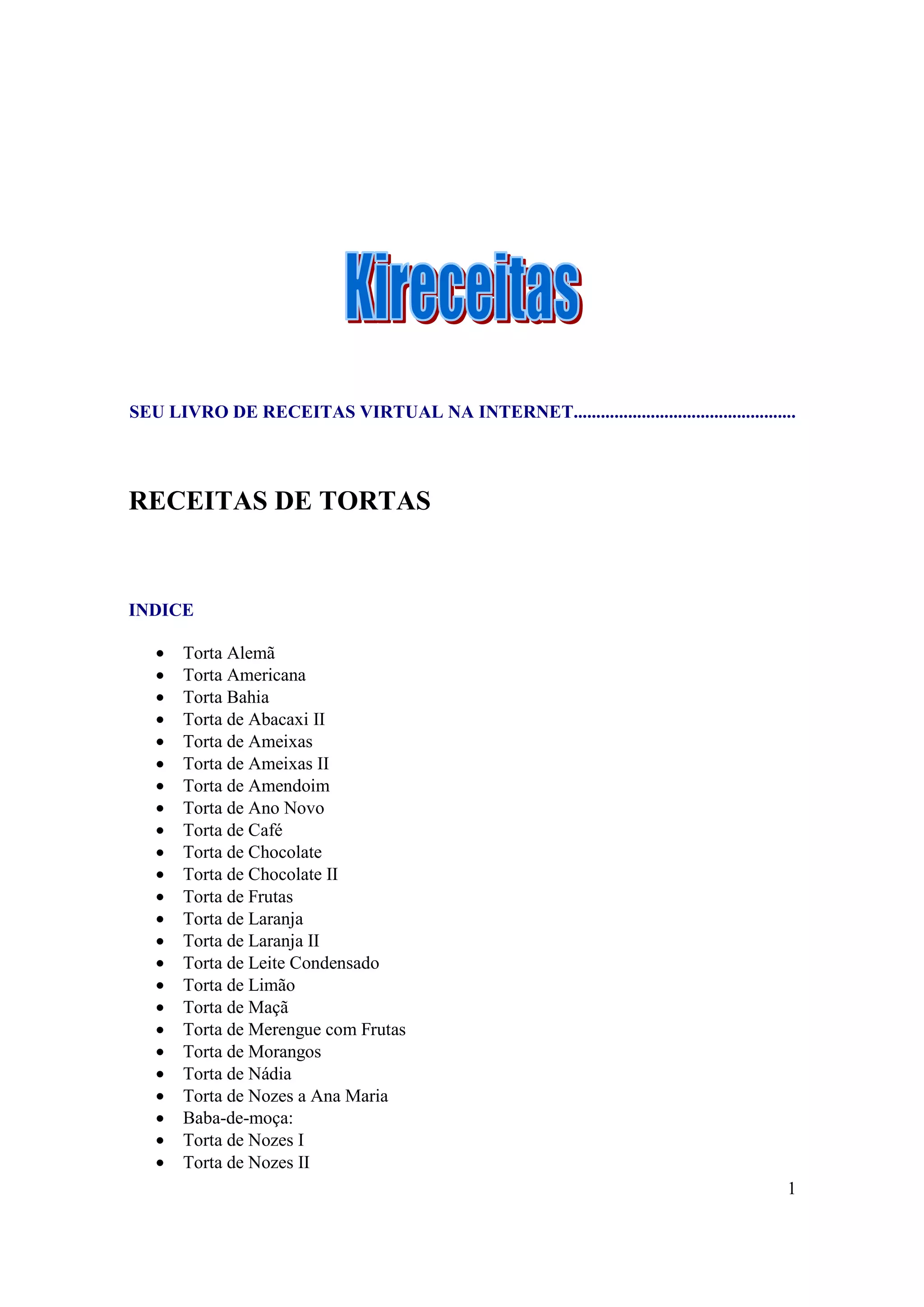 Este documento contém receitas de vários tipos de tortas, incluindo Torta Alemã, Torta Americana, Torta Bahia, Torta de Abacaxi, Torta de Ameixas, Torta de Amendoim e Torta de Ano Novo. Fornece instruções detalhadas sobre ingredientes e modo de preparo para cada receita.