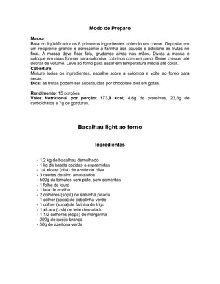O documento apresenta duas receitas leves para a Páscoa: (1) uma colomba de páscoa light feita com fermento biológico, ovos, leite em pó e farinha e coberta com clara de ovo e castanhas; (2) um bacalhau ao forno light preparado com bacalhau, batata, tomate, ervilha e queijo branco. As receitas fornecem opções para quem deseja fugir dos excessos nas festas ou segue uma dieta.