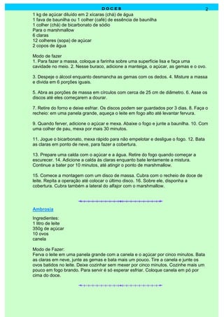 O documento contém receitas de diversos doces brasileiros como pudim de leite, arroz doce, alfajor Rogel e ambrosia. Inclui também receitas de beijos, bolachas, bolinhos e bombas, com instruções detalhadas para preparar cada doce.