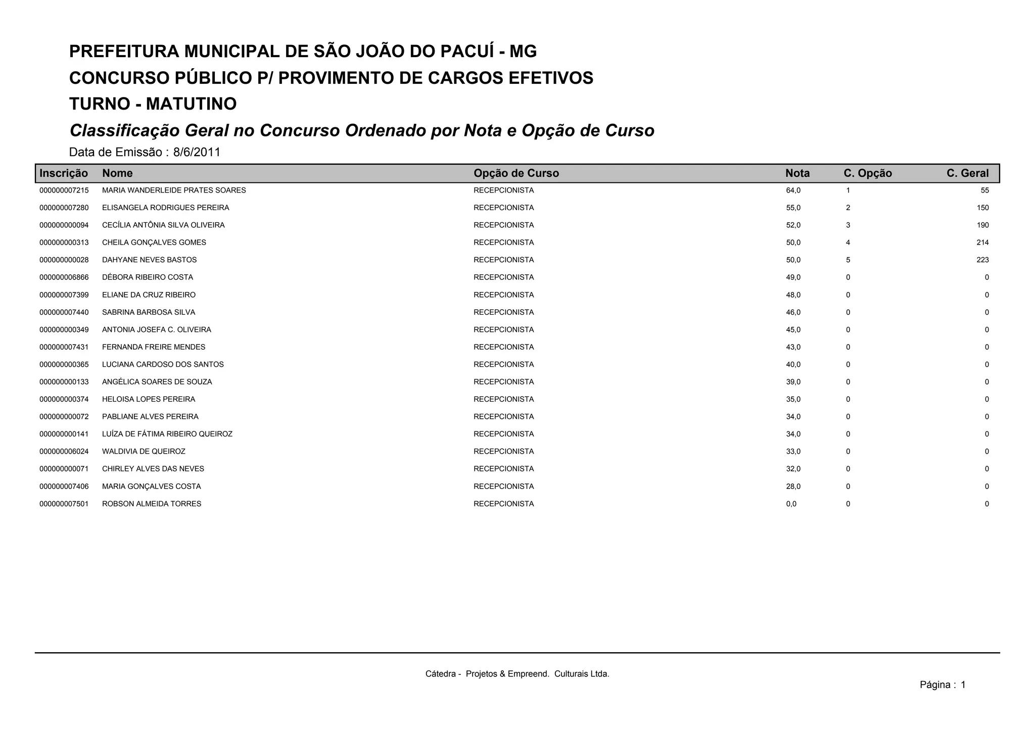 Este documento apresenta os resultados de um concurso público para o cargo de recepcionista na Prefeitura Municipal de São João do Pacuí (MG). Nele consta a classificação geral dos candidatos ordenada por nota e opção de curso, com a candidata Maria Wanderleide Prates Soares em primeiro lugar com a nota 64,0 e Elisangela Rodrigues Pereira em segundo com 55,0.
