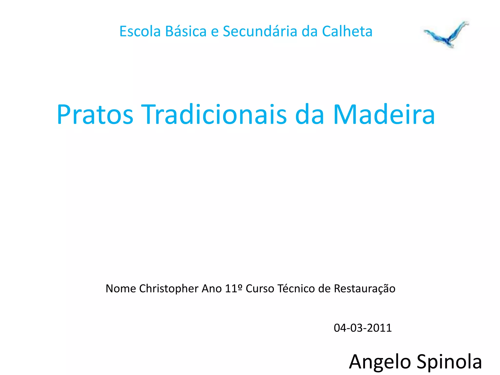 Três pratos tradicionais da Madeira são descritos: 1) Filetes de espada fritos com milho frito, 2) Lapas de escabeche em vinagre e azeite, 3) Bacalhau em pau de louro grelhado. Receitas adicionais incluem cabeça de porco cozida e vários doces típicos como pudim de maracujá e broas da Madeira.