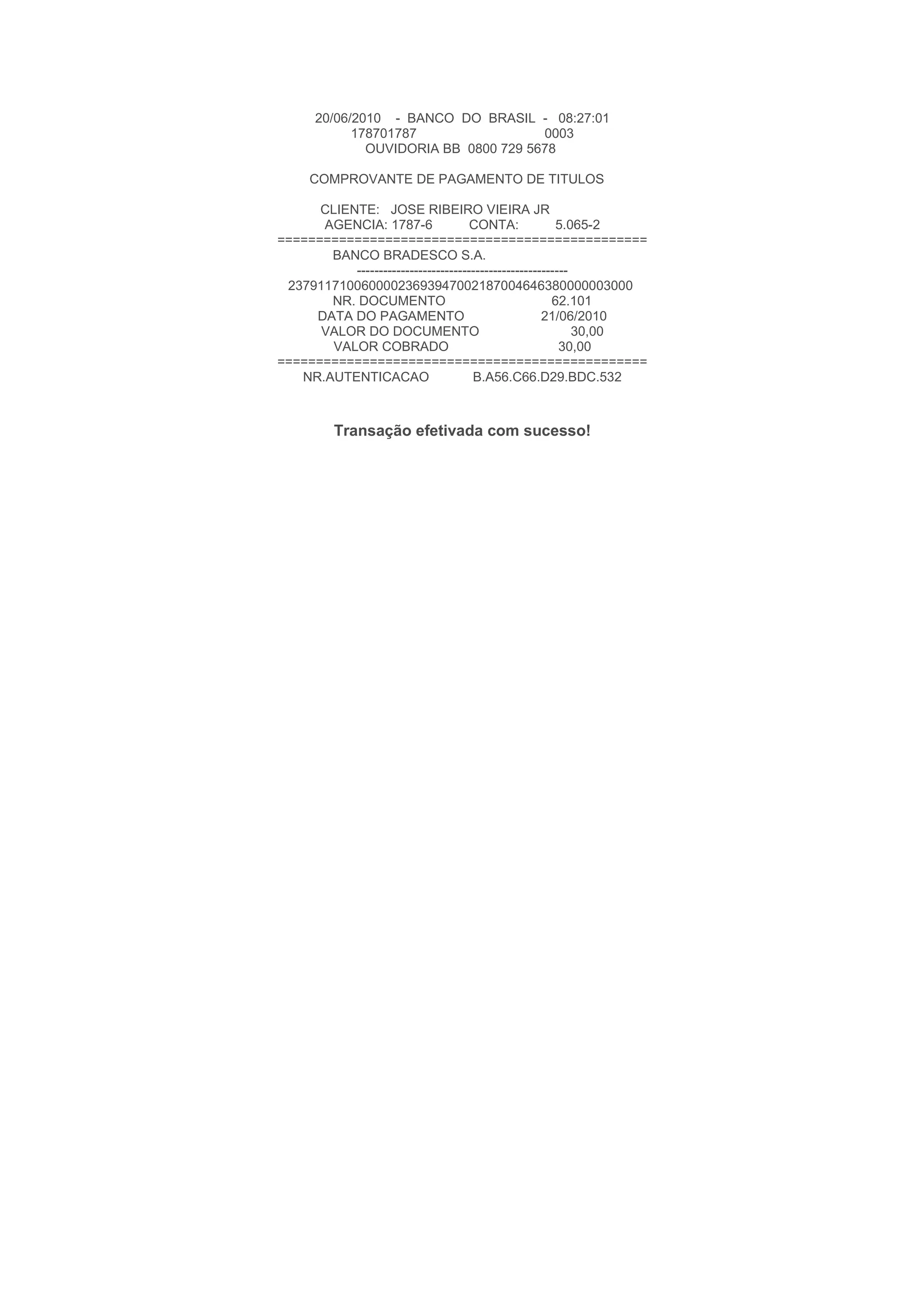 O documento é um comprovante de pagamento de títulos emitido pelo Banco do Brasil em 20/06/2010 para o cliente José Ribeiro Vieira Jr. Nele consta o número do documento pago, data e valor do pagamento de R$30,00 feito com sucesso para quitar o título no 62.101 do Banco Bradesco.