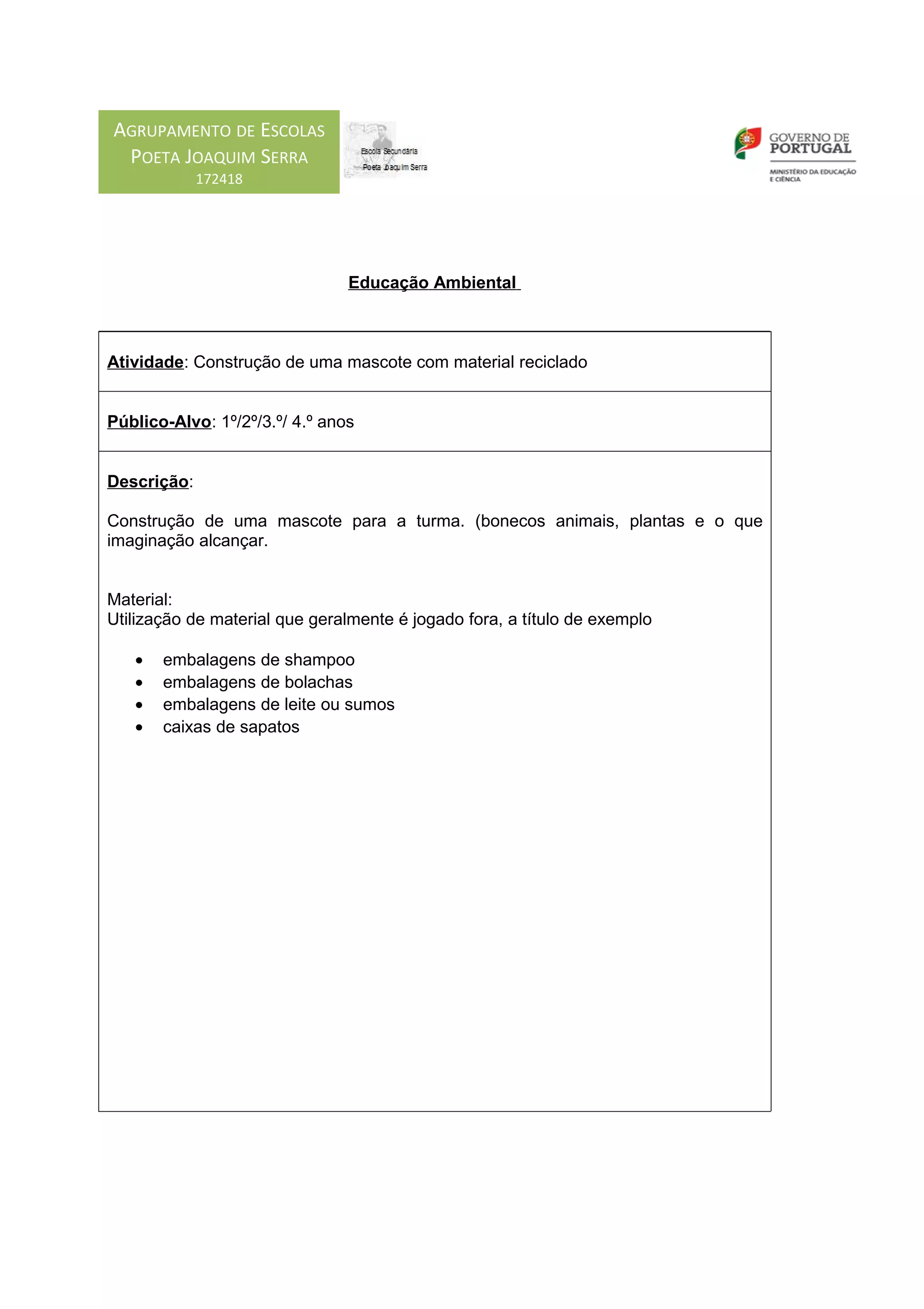 Este documento descreve atividades educacionais relacionadas à educação ambiental para alunos dos 1o aos 4o anos. As atividades incluem a construção de mascotes, espantalhos e brinquedos usando materiais reciclados, bem como a construção de ecopontos e um acróstico sobre redução, reutilização e reciclagem.