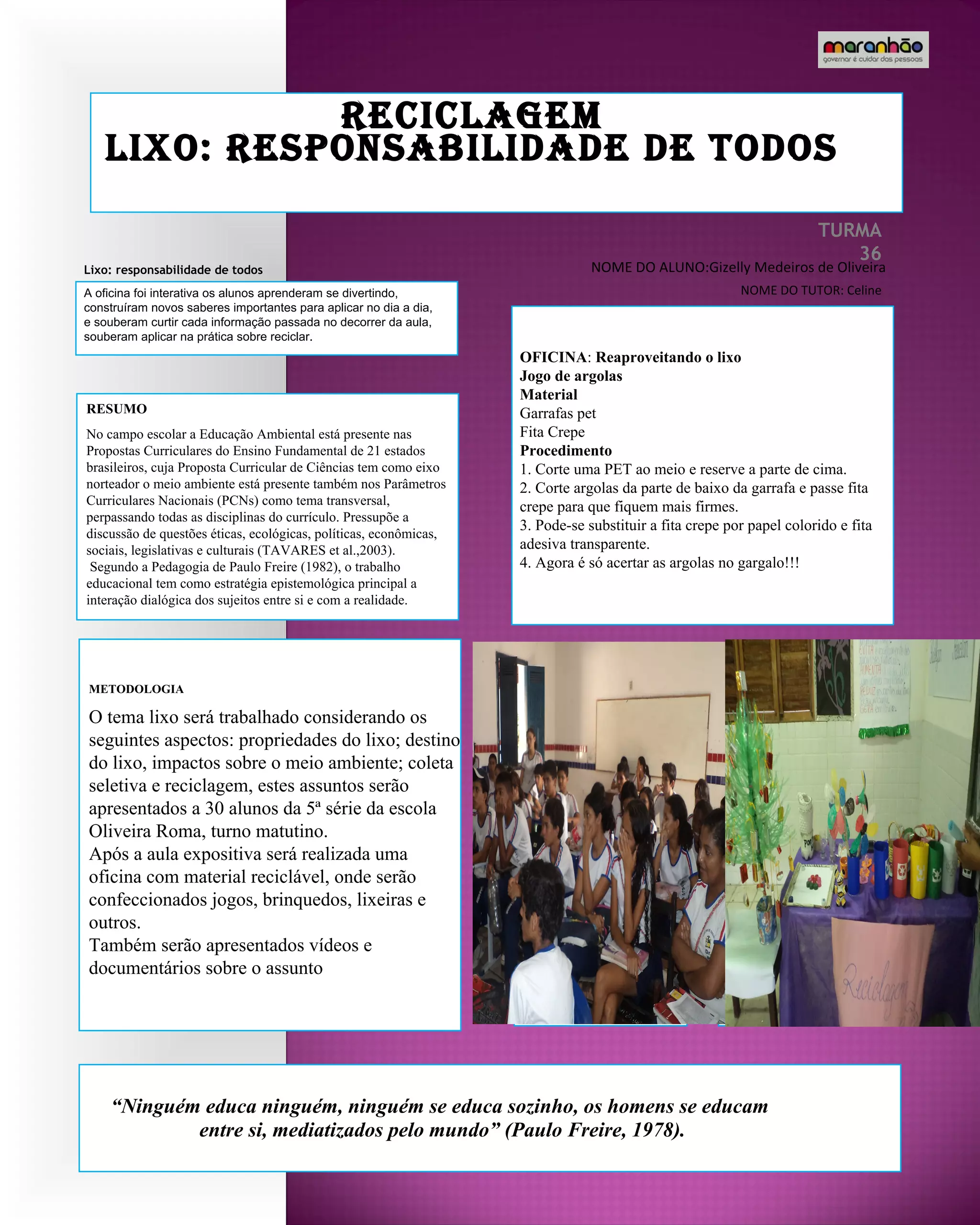 O documento discute a importância da educação ambiental e da reciclagem. Ele descreve uma oficina realizada com alunos da 5a série sobre reciclagem onde eles aprenderam de forma interativa e construíram saberes para aplicar no dia a dia. A oficina incluiu a confecção de jogos e brinquedos com materiais recicláveis.