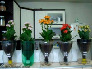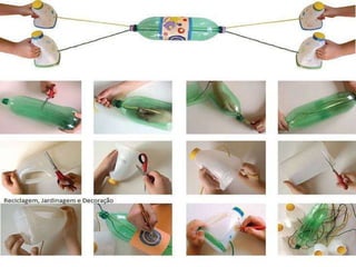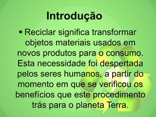 O documento discute os benefícios da reciclagem para o meio ambiente, incluindo a redução da poluição, a geração de empregos e a preservação de recursos naturais. Ele também fornece instruções sobre como separar o lixo reciclável por cores e exemplos de materiais que podem ser reciclados, como vidro, papel, metal e plástico.