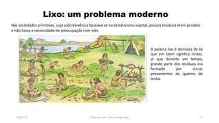 O documento discute o problema do lixo moderno, desde as sociedades primitivas até a era dos descartáveis. Apresenta a classificação do lixo de acordo com a origem, os materiais mais comuns encontrados no lixo e seus tempos de decomposição na natureza, as formas de destinação do lixo e os benefícios da reciclagem.
