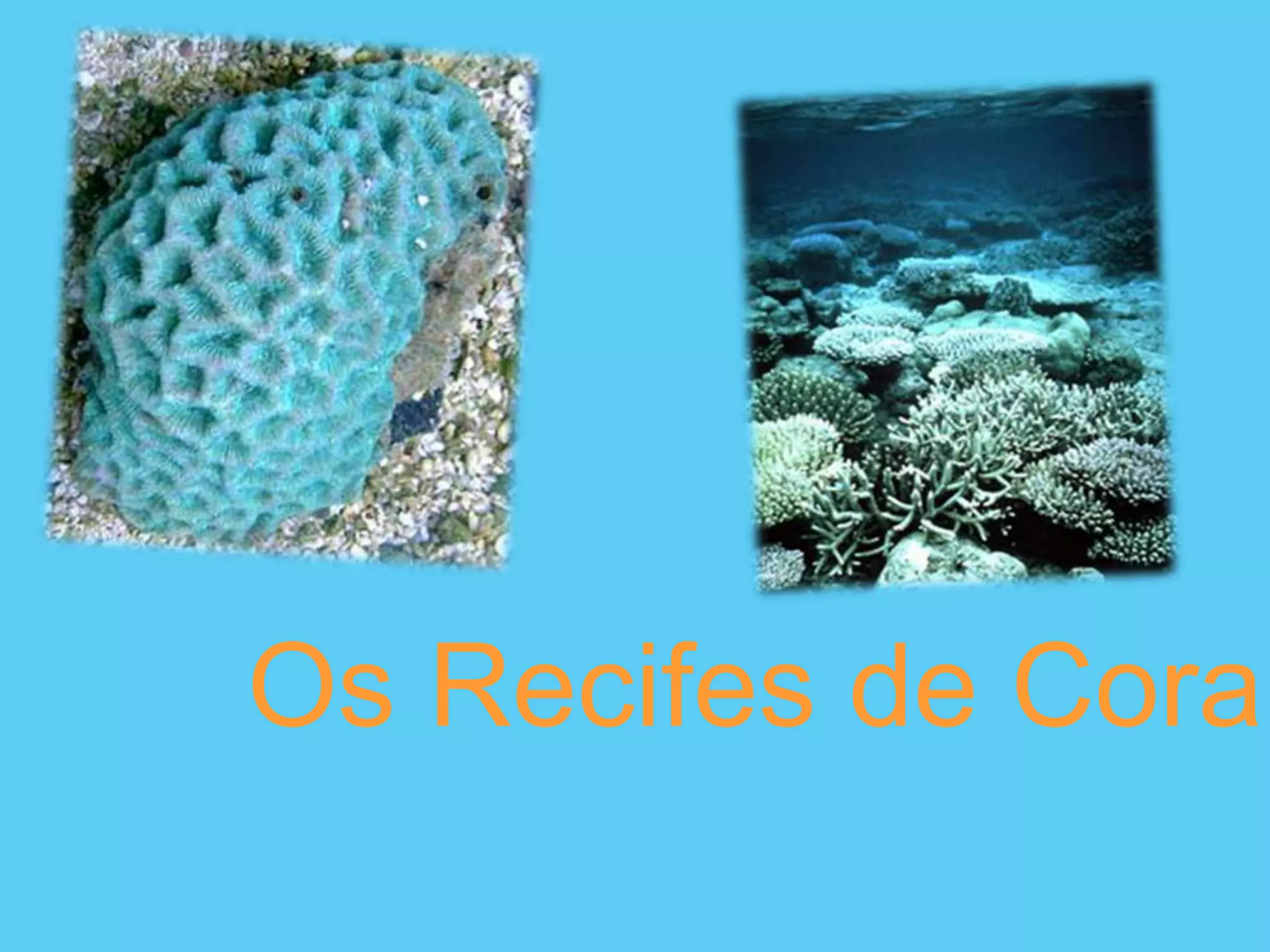 Os recifes de coral formam-se ao longo de milhares de anos por pólipos de coral que constroem estruturas de carbonato de cálcio. Os recifes só crescem em águas quentes e pouco profundas, abrigando grande biodiversidade e protegendo as costas. Os corais podem ser duros com esqueleto externo ou moles sem esqueleto.