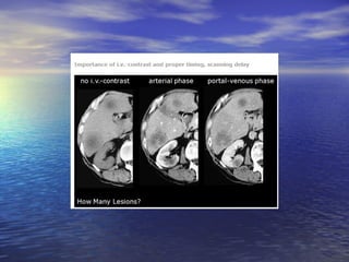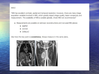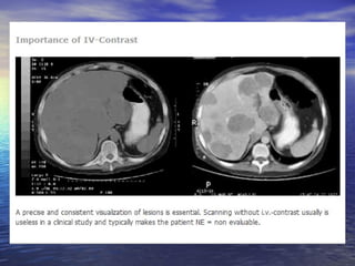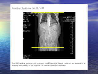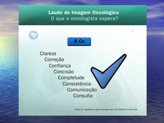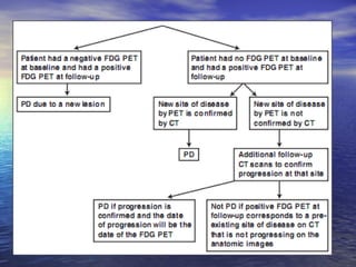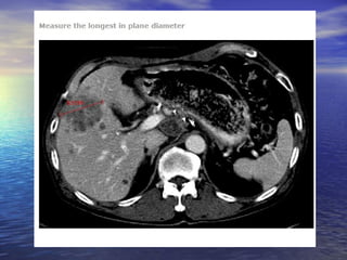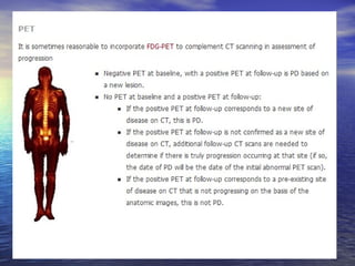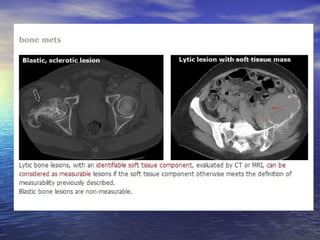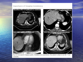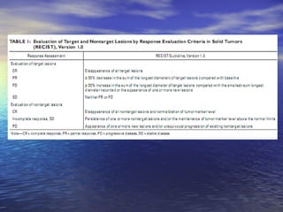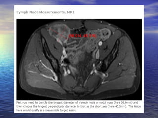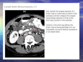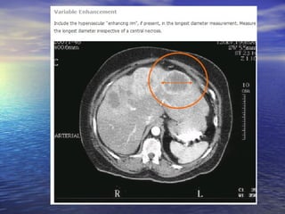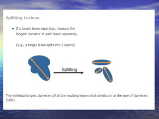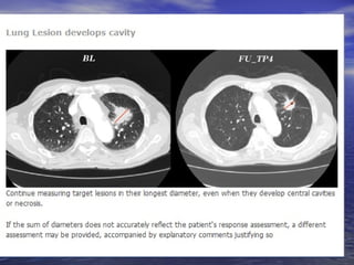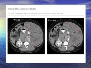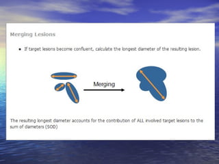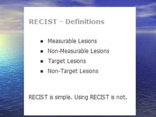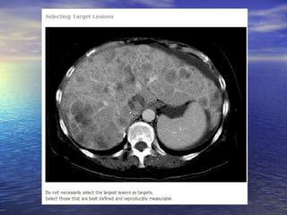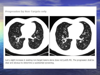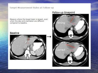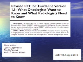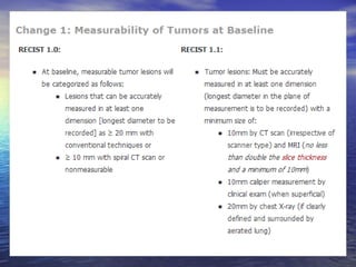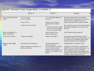 Este documento discute as diferenças entre as versões 1.0 e 1.1 dos critérios RECIST para avaliação de resposta tumoral em ensaios clínicos. Apresenta critérios para classificação de linfonodos e lesões como alvo ou não-alvo, e define progressão da doença como um aumento absoluto de 5mm ou 20% na soma dos diâmetros das lesões alvo. Também discute a avaliação de lesões pulmonares escavadas e a importância da fase do contraste na tomografia computadorizada.